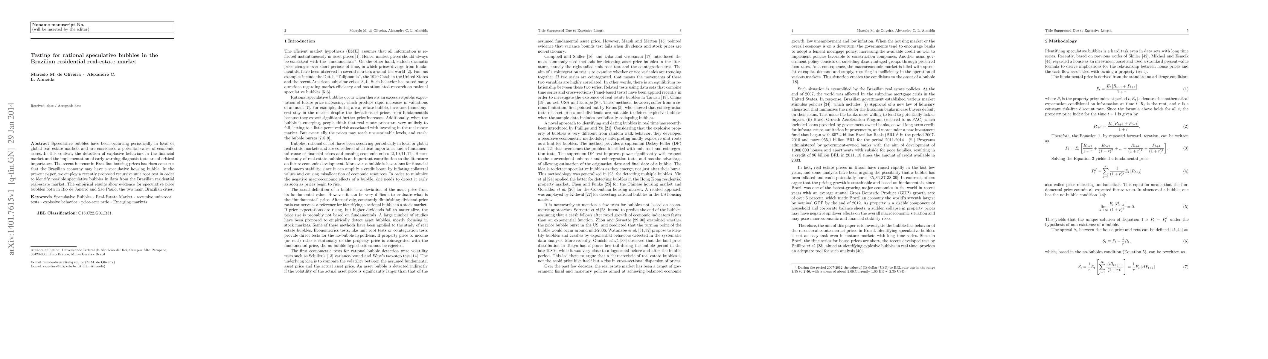 This paper investigates the presence of speculative bubbles in Brazil's residential real-estate market using a recursive unit root test. The findings indicate the existence of speculative bubbles in the housing markets of Rio de Janeiro and Sao Paulo, raising concerns about potential economic risks.