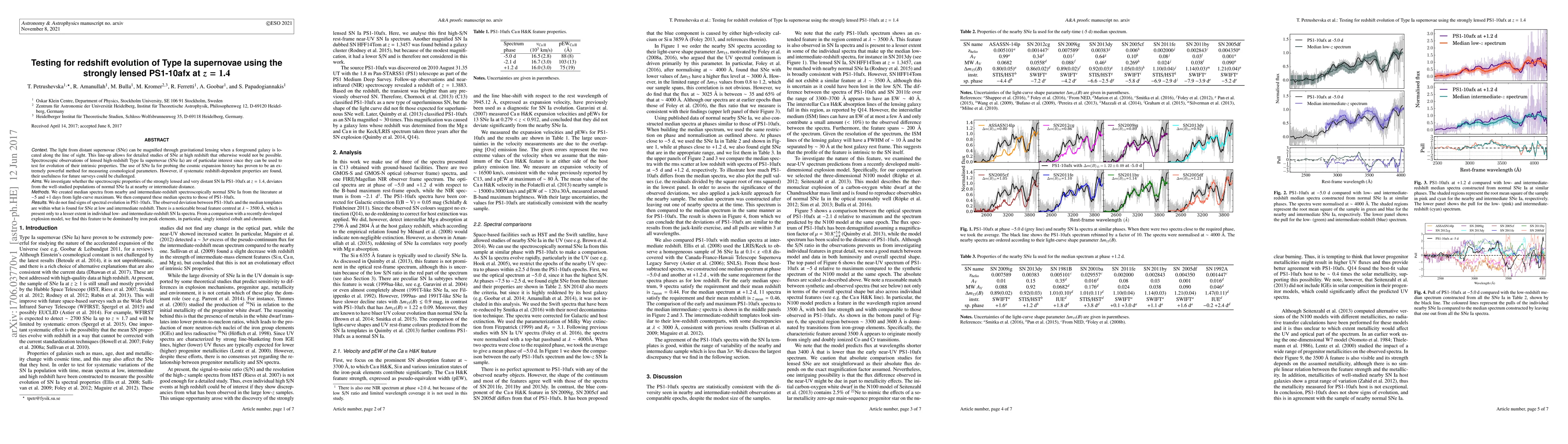 This study investigates the spectroscopic properties of the strongly lensed Type Ia supernova PS1-10afx at $z=1.4$ to test for redshift evolution. No significant spectral evolution was found, suggesting PS1-10afx's properties align with those of nearby SNe Ia, though a broad feature at $\rm \lambda\sim 3500$~\AA{} indicates the presence of iron peak elements.