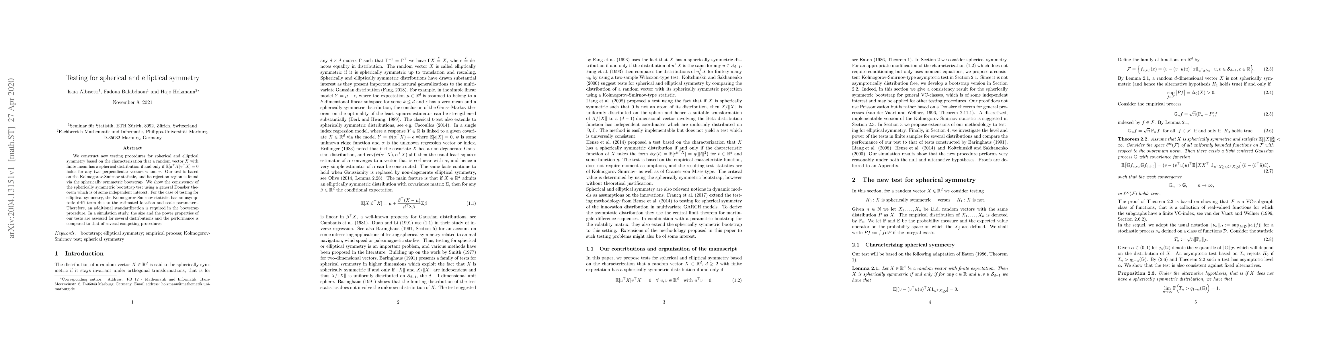 This paper develops new tests for spherical and elliptical symmetry using the Kolmogorov-Smirnov statistic, with the spherically symmetric bootstrap for rejection regions. It also addresses the asymptotic drift in elliptical symmetry tests and compares the performance of the proposed tests to existing methods through simulations.