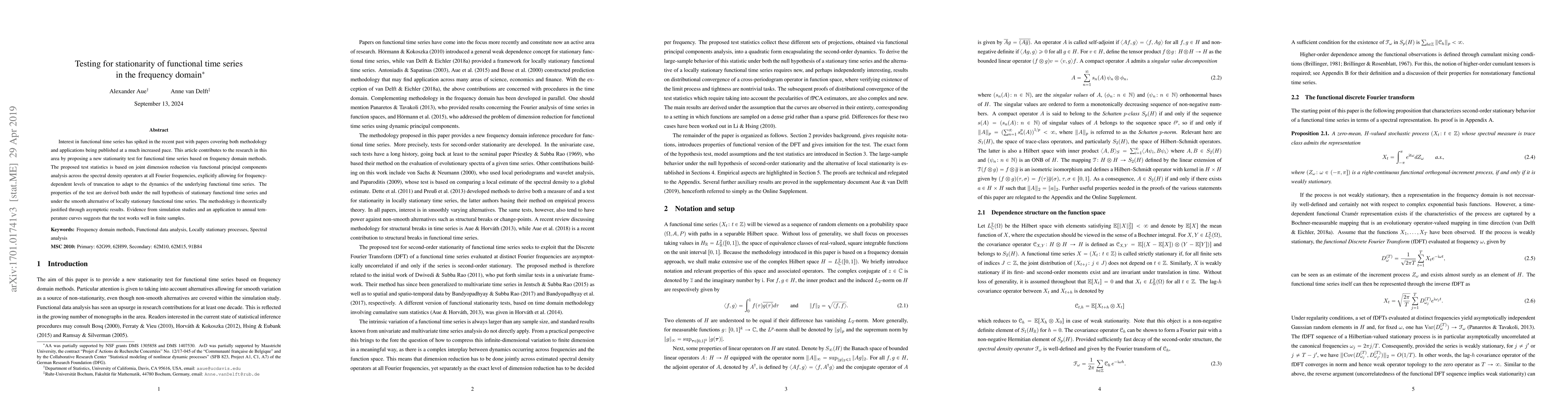 Interest in functional time series has spiked in the recent past with papers covering both methodology and applications being published at a much increased pace. This article contributes to the research in this area by proposing a new stationarity test for functional time series based on frequency domain methods. The proposed test statistics is based on joint dimension reduction via functional principal components analysis across the spectral density operators at all Fourier frequencies, explicitly allowing for frequency-dependent levels of truncation to adapt to the dynamics of the underlying functional time series. The properties of the test are derived both under the null hypothesis of stationary functional time series and under the smooth alternative of locally stationary functional time series. The methodology is theoretically justified through asymptotic results. Evidence from simulation studies and an application to annual temperature curves suggests that the test works well in finite samples.