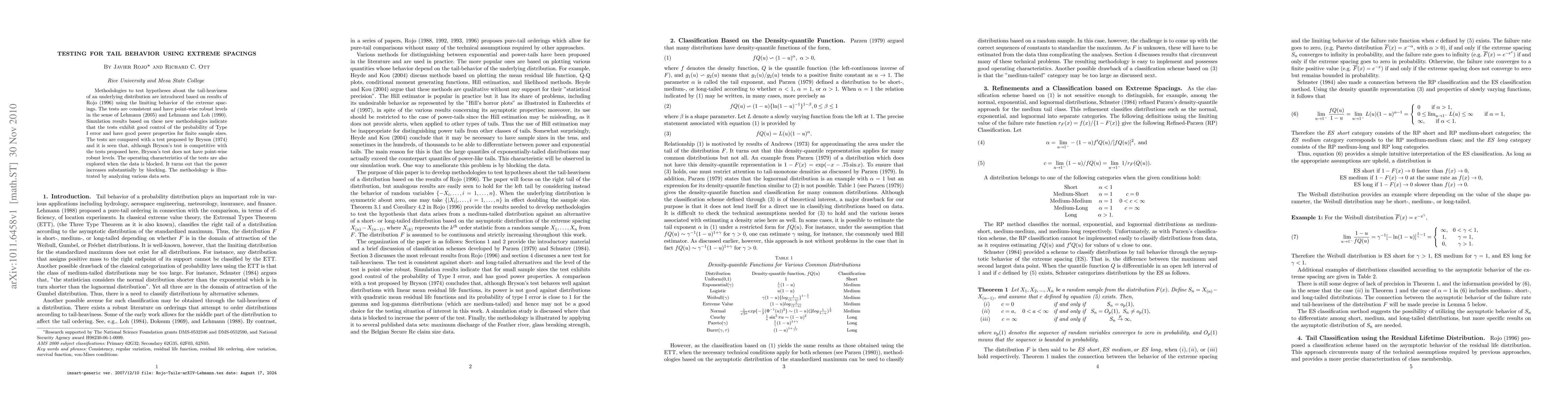 Methodologies to test hypotheses about the tail-heaviness of an underlying distribution are introduced based on results of Rojo (1996) using the limiting behavior of the extreme spacings. The tests are consistent and have point-wise robust levels in the sense of Lehmann (2005) and Lehmann and Loh (1990). Simulation results based on these new methodologies indicate that the tests exhibit good control of the probability of Type I error and have good power properties for finite sample sizes. The tests are compared with a test proposed by Bryson (1974) and it is seen that, although Bryson's test is competitive with the tests proposed here, Bryson's test does not have point-wise robust levels. The operating characteristics of the tests are also explored when the data is blocked. It turns out that the power increases substantially by blocking. The methodology is illustrated by analyzing various data sets.