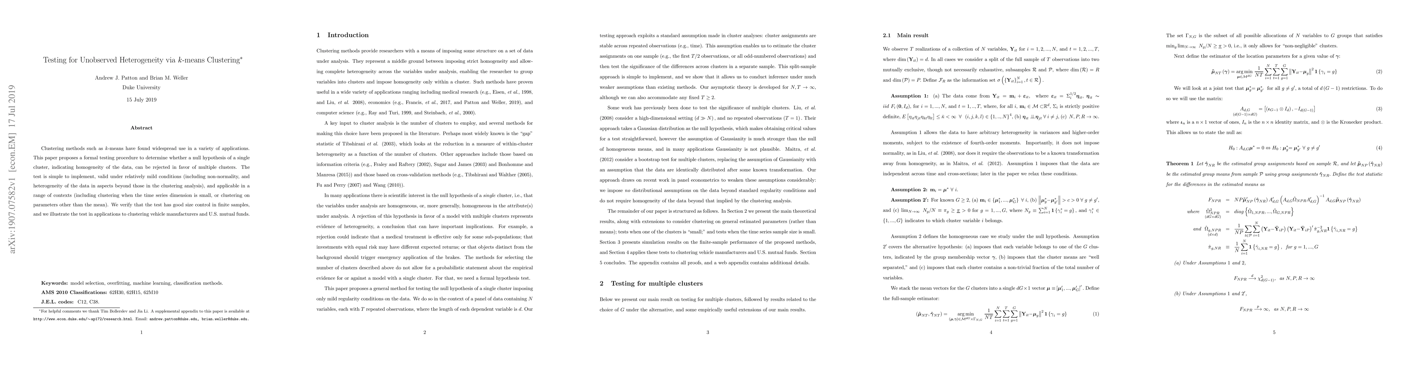 This paper proposes a testing procedure for k-means clustering to determine if data is heterogeneous, allowing for multiple clusters instead of one. The test has good size control and can be applied in various contexts, including non-normality and small time series dimensions.