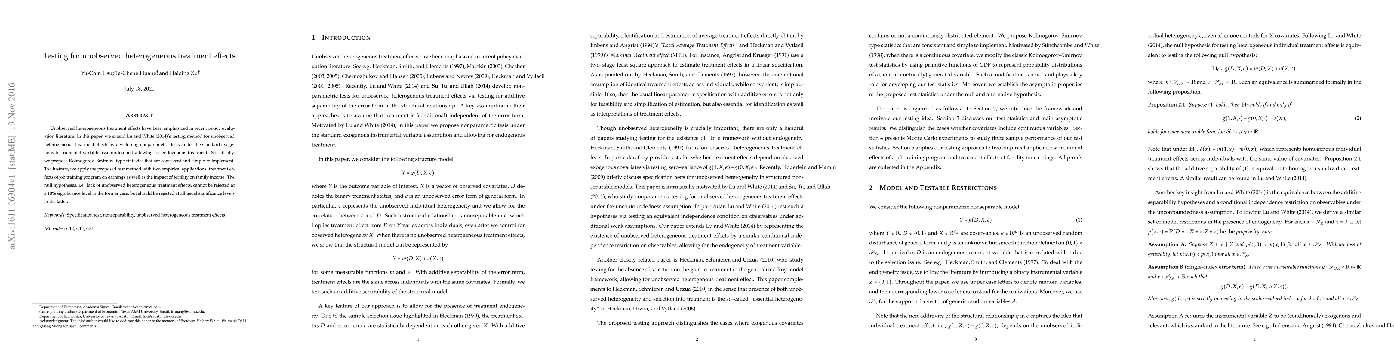 This paper develops nonparametric tests for unobserved heterogeneous treatment effects under both exogenous and endogenous treatment scenarios, using Kolmogorov-Smirnov-type statistics. Empirical applications to job training and fertility impacts show mixed results, failing to reject the null in the former but rejecting it in the latter.
