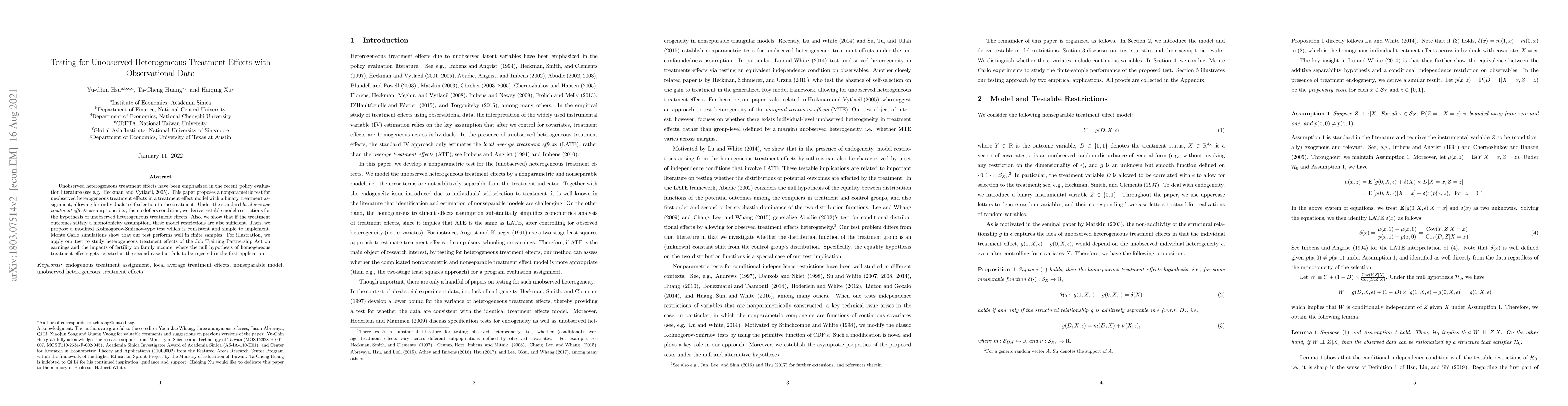 This paper proposes a nonparametric test for unobserved heterogeneous treatment effects in observational data, demonstrating its application to policy evaluations like the Job Training Partnership Act and fertility impacts. The test, consistent and simple, performs well in simulations, showing rejection of the null hypothesis in some cases.