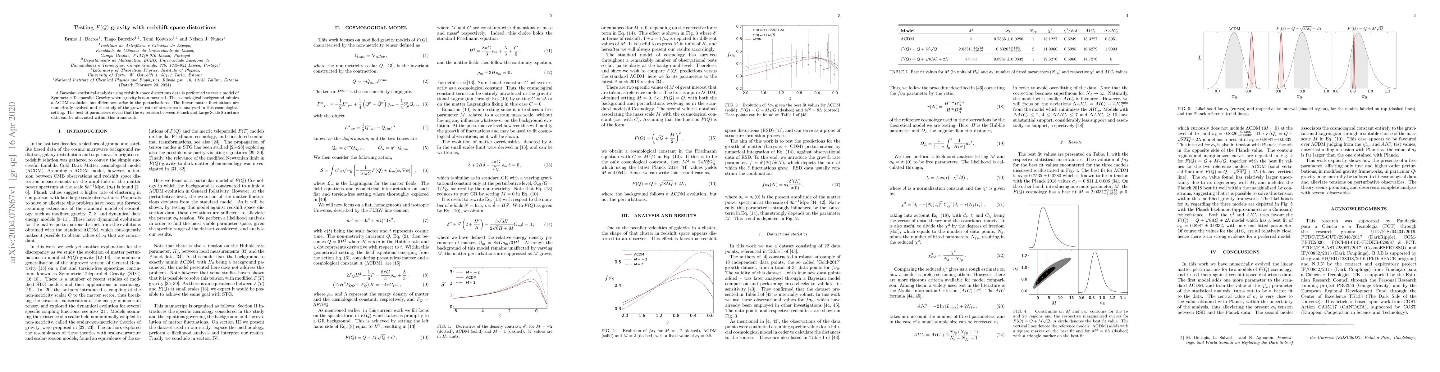 This paper tests Symmetric Teleparallel Gravity using Bayesian analysis of redshift space distortions, finding that it can alleviate the $\sigma_8$ tension between Planck and Large Scale Structure data while maintaining a $\Lambda$CDM-like cosmological background.