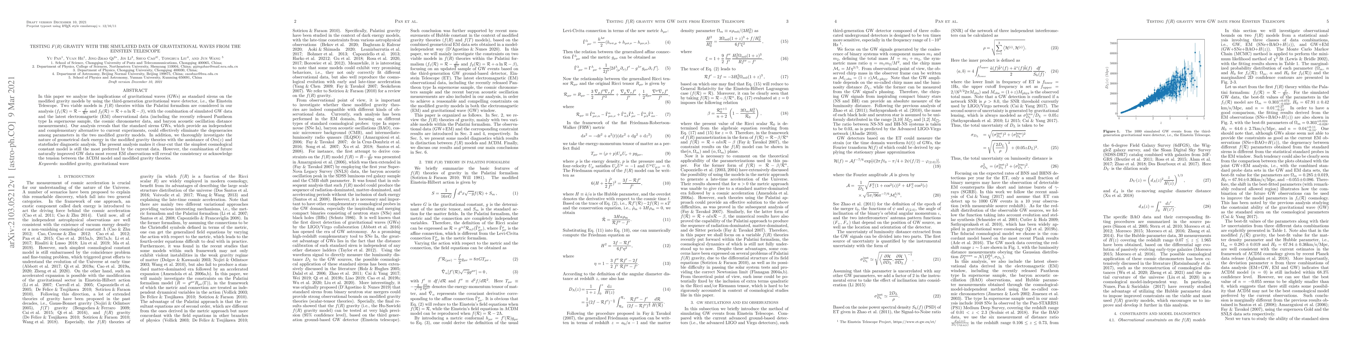 In this paper we analyze the implications of gravitational waves (GWs) as standard sirens on the modified gravity models by using the third-generation gravitational wave detector, i.e., the Einstein Telescope. Two viable models in $f(R)$ theories within the Palatini formalism are considered in our analysis ($f_{1}(\mathcal{R})=\mathcal{R}-\frac{\beta}{\mathcal{R}^{n}}$ and $f_{2}(\mathcal{R})=\mathcal{R}+\alpha\ln{\mathcal{R}}-\beta$), with the combination of simulated GW data and the latest electromagnetic (EM) observational data (including the recently released Pantheon type Ia supernovae sample, the cosmic chronometer data, and baryon acoustic oscillation distance measurements). Our analysis reveals that the standard sirens GWs, which provide an independent and complementary alternative to current experiments, could effectively eliminate the degeneracies among parameters in the two modified gravity models. In addition, we thoroughly investigate the nature of geometrical dark energy in the modified gravity theories with the assistance of $Om(z)$ and statefinder diagnostic analysis. The present analysis makes it clear-cut that the simplest cosmological constant model is still the most preferred by the current data. However, the combination of future naturally improved GW data most recent EM observations will reveal the consistency or acknowledge the tension between the $\Lambda$CDM model and modified gravity theories.