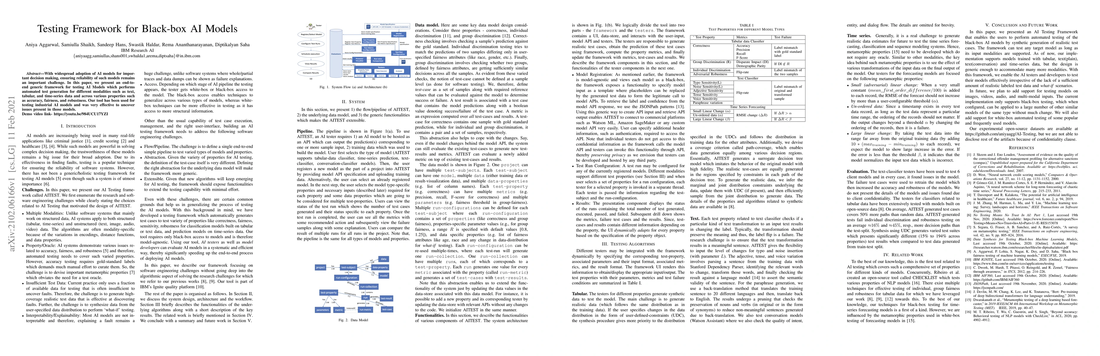 With widespread adoption of AI models for important decision making, ensuring reliability of such models remains an important challenge. In this paper, we present an end-to-end generic framework for testing AI Models which performs automated test generation for different modalities such as text, tabular, and time-series data and across various properties such as accuracy, fairness, and robustness. Our tool has been used for testing industrial AI models and was very effective to uncover issues present in those models. Demo video link: https://youtu.be/984UCU17YZI