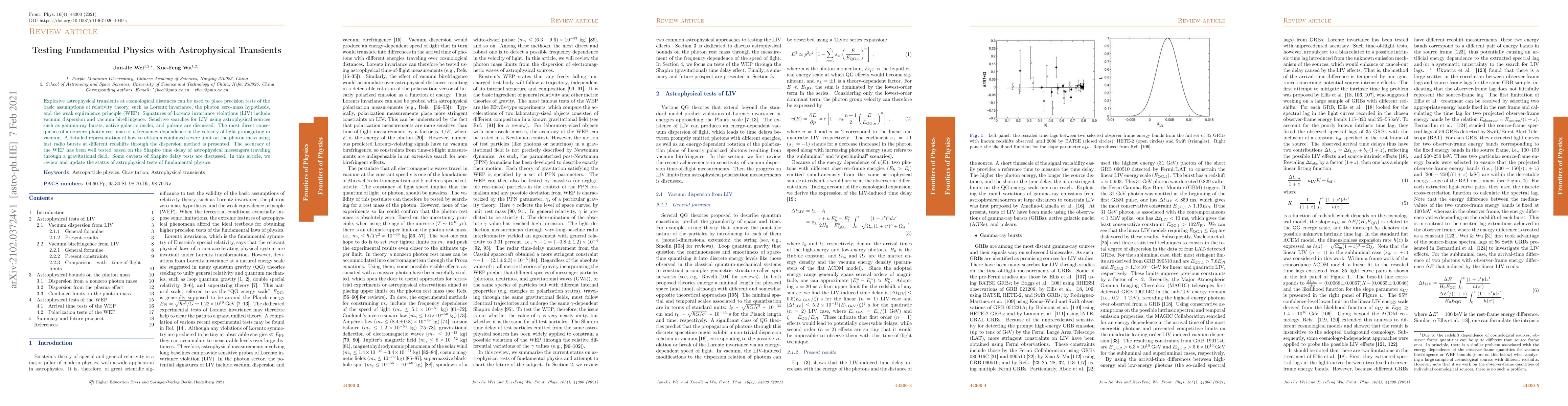 This paper reviews precision tests using astrophysical transients to examine fundamental physics theories, including Lorentz invariance, photon mass, and the weak equivalence principle. It highlights methods for detecting Lorentz invariance violations and photon mass through dispersion and birefringence, and discusses the accuracy of gravitational field tests using Shapiro time delay.
