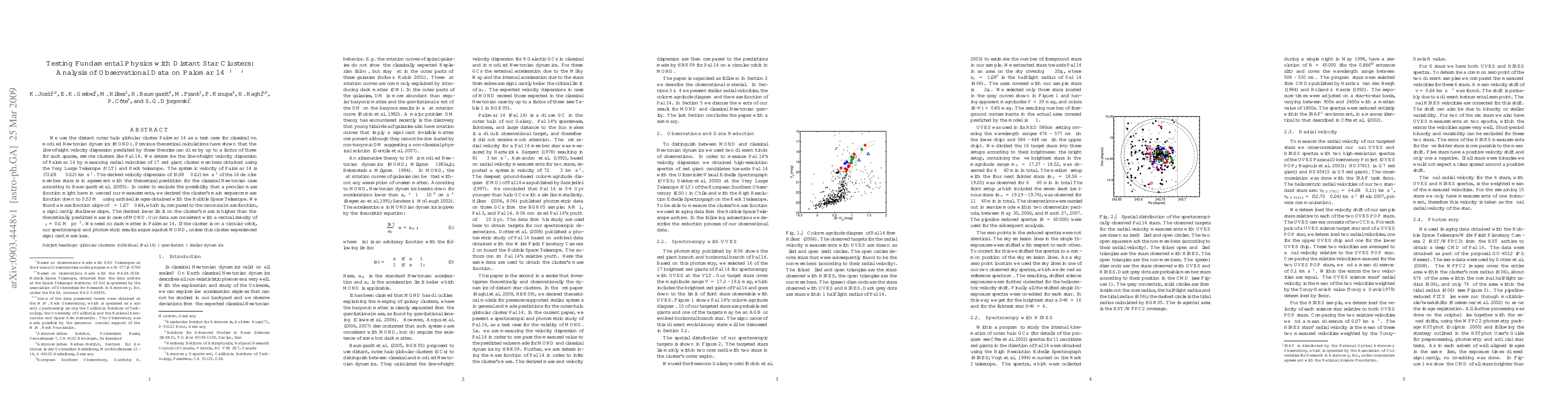 We use the distant outer halo globular cluster Palomar 14 as a test case for classical vs. modified Newtonian dynamics (MOND). Previous theoretical calculations have shown that the line-of-sight velocity dispersion predicted by these theories can differ by up to a factor of three for such sparse, remote clusters like Pal 14. We determine the line-of-sight velocity dispersion of Palomar 14 by measuring radial velocities of 17 red giant cluster members obtained using the Very Large Telescope (VLT) and Keck telescope. The systemic velocity of Palomar 14 is (72.28+-0.12)km/s. The derived velocity dispersion of (0.38+-0.12)km/s of the 16 definite member stars is in agreement with the theoretical prediction for the classical Newtonian case according to Baumgardt et al. (2005). In order to exclude the possibility that a peculiar mass function might have influenced our measurements, we derived the cluster's main sequence mass function down to 0.53Msolar using archival images obtained with the Hubble Space Telescope. We found a mass function slope of 1.27+-0.44, which is, compared to the canonical mass function, a significantly shallower slope. The derived lower limit on the cluster's mass is higher than the theoretically predicted mass in case of MOND. Our data are consistent with a central density of 0.1 Msolar pc^-3. We need no dark matter in Palomar 14. If the cluster is on a circular orbit, our spectroscopic and photometric results argue against MOND, unless this cluster experienced significant mass loss.