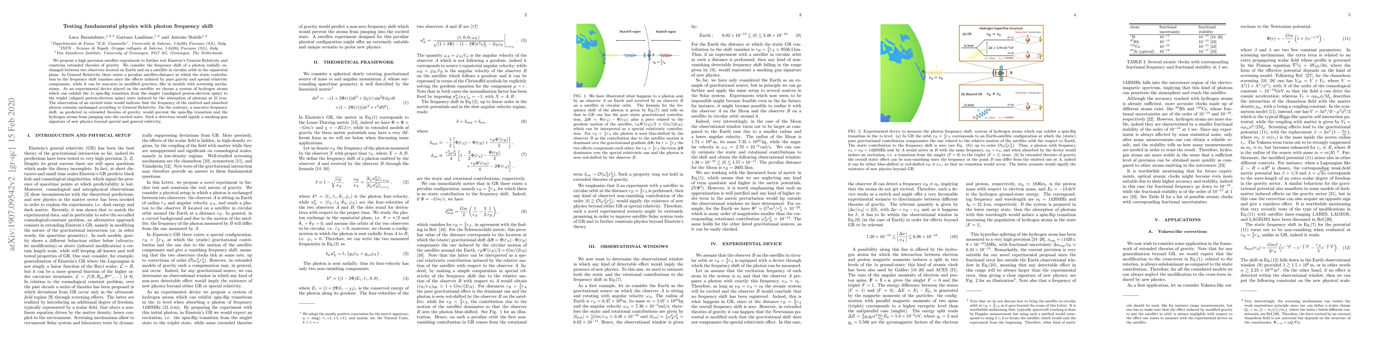 We propose a high precision satellite experiment to further test Einstein's General Relativity and constrain extended theories of gravity. We consider the frequency shift of a photon radially exchanged between two observers located on Earth and on a satellite in circular orbit in the equatorial plane. In General Relativity there exists a peculiar satellite-distance at which the static contribution to the frequency shift vanishes since the effects induced by pure gravity and special relativity compensate, while it can be non-zero in modified gravities, like in models with screening mechanisms. As an experimental device placed on the satellite we choose a system of hydrogen atoms which can exhibit the $1$s spin-flip transition from the singlet (unaligned proton-electron spins) to the triplet (aligned proton-electron spins) state induced by the absorption of photons at $21.1$cm. The observation of an excited state would indicate that the frequency of the emitted and absorbed photon remains unchanged according to General Relativity. On the contrary, a non-zero frequency shift, as predicted in extended theories of gravity, would prevent the spin-flip transition and the hydrogen atoms from jumping into the excited state. Such a detection would signify a smoking-gun signature of new physics beyond special and general relativity.