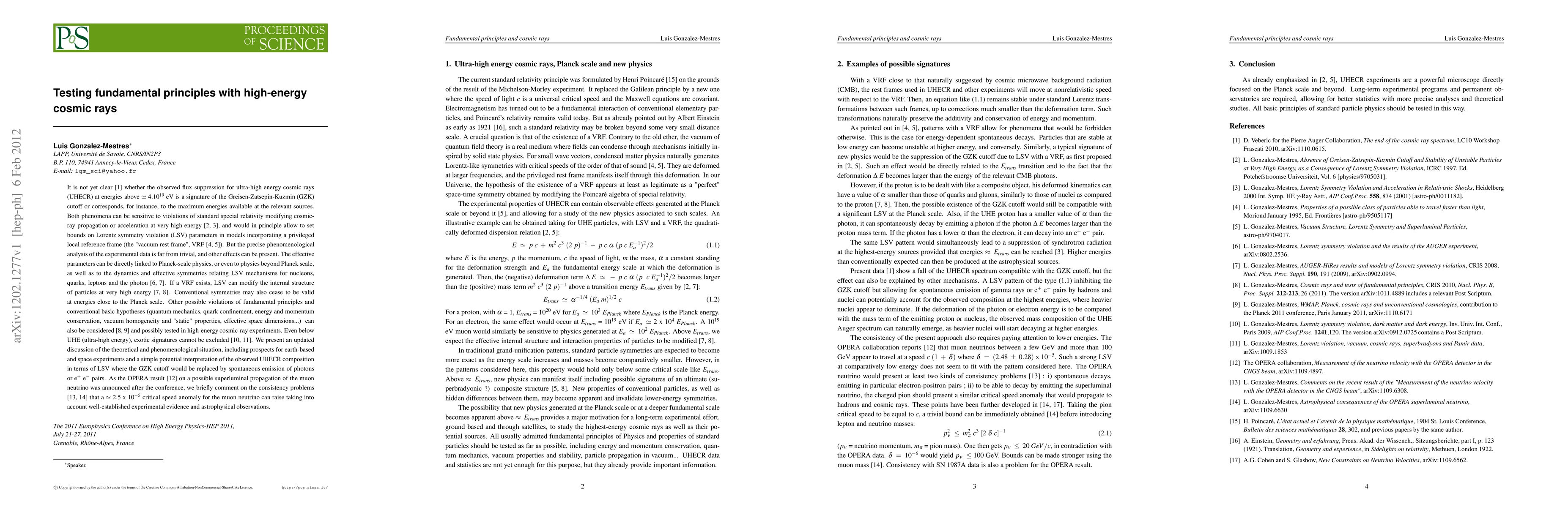 It is not yet clear whether the observed flux suppression for ultra-high energy cosmic rays (UHECR) at energies above \simeq 4.10E19 eV is a signature of the Greisen-Zatsepin-Kuzmin (GZK) cutoff or corresponds, for instance, to the maximum energies available at the relevant sources. Both phenomena can be sensitive to violations of standard special relativity modifying cosmic-ray propagation or acceleration at very high energy, and would in principle allow to set bounds on Lorentz symmetry violation (LSV) parameters. But the precise phenomenological analysis of the experimental data is far from trivial, and other effects can be present. The effective parameters can be directly linked to Planck-scale physics or to physics beyond Planck scale. If a vacuum rest frame (VRF) exists, LSV can modify the internal structure of particles at very high energy. Conventional symmetries may also cease to be valid at energies close to the Planck scale. Other possible violations of fundamental principles and conventional basic hypotheses (quantum mechanics, quark confinement, energy and momentum conservation, vacuum homogeneity and "static" properties, effective space dimensions...) can also be considered and possibly tested in high-energy cosmic-ray experiments. Even below UHE (ultra-high energy), exotic signatures cannot be excluded. We present an updated discussion of the theoretical and phenomenological situation, including prospects for earth-based and space experiments and a simple potential interpretation of the observed UHECR composition in terms of LSV where the GZK cutoff would be replaced by spontaneous emission of photons or e+ e- pairs. As the OPERA result on a possible superluminal propagation of the muon neutrino was announced after the conference, we briefly comment on the consistency problems that a \simeq 2.5 x 10E-5 critical speed anomaly for the muon neutrino can raise.