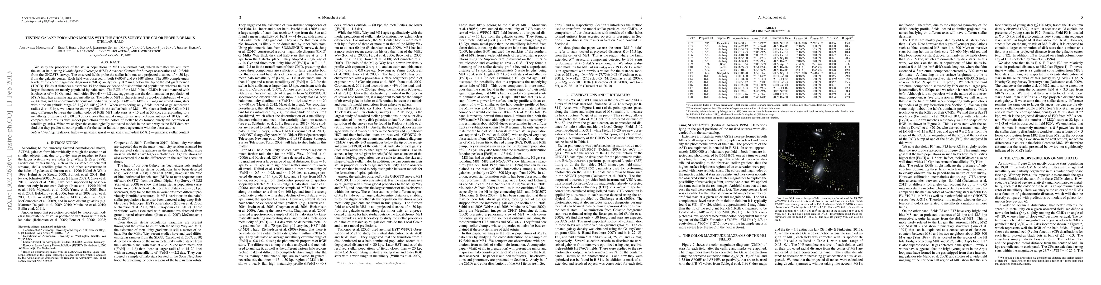 This study uses HST observations from the GHOSTS survey to analyze M81's stellar halo, finding a consistent color of (F606W - F814W) ~ 1 mag for halo stars at various distances, indicating similar stellar populations aged around 10 Gyr with [Fe/H] ~ -1.2 dex. No color gradient was detected in the stellar halo out to 50 kpc, aligning with model predictions of stellar halos formed via satellite galaxy accretion.