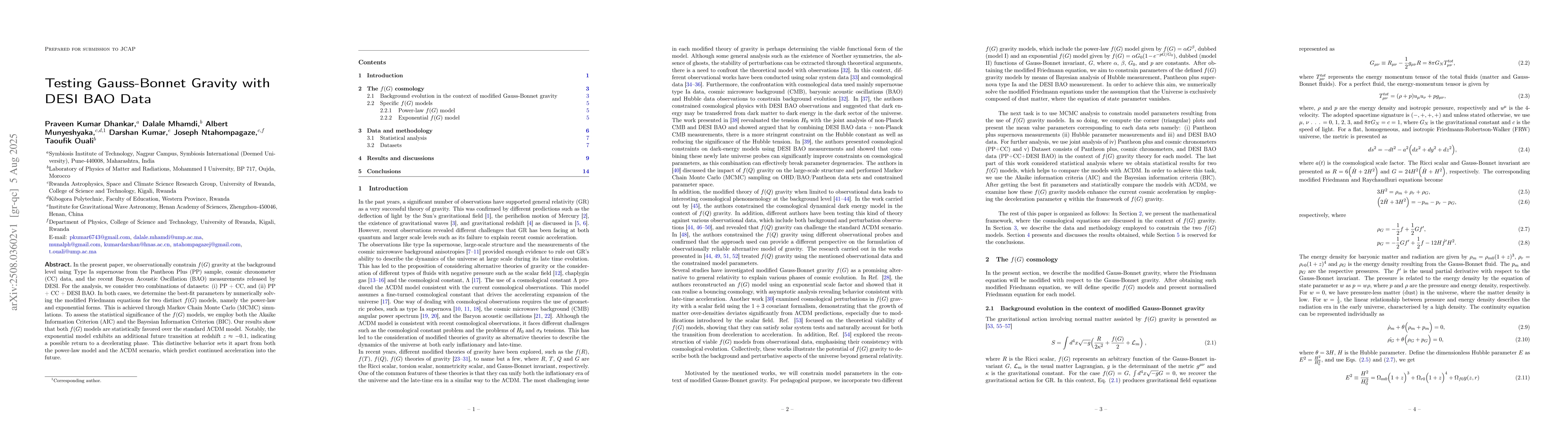 In the present paper, we observationally constrain f (G) gravity at the background level using Type Ia supernovae from the Pantheon Plus (PP) sample, cosmic chronometer (CC) data, and the recent Baryon Acoustic Oscillation (BAO) measurements released by DESI. For the analysis, we consider two combinations of datasets: (i) PP + CC, and (ii) PP + CC + DESI BAO. In both cases, we determine the best-fit parameters by numerically solving the modified Friedmann equations for two distinct f (G) models, namely the power-law and exponential forms. This is achieved through Markov Chain Monte Carlo (MCMC) simulations. To assess the statistical significance of the f (G) models, we employ both the Akaike Information Criterion (AIC) and the Bayesian Information Criterion (BIC). Our results show that both f (G) models are statistically favored over the standard {\Lambda}CDM model. Notably, the exponential model exhibits an additional future transition at redshift closer to -0.1, indicating a possible return to a decelerating phase. This distinctive behavior sets it apart from both the power-law model and the {\Lambda}CDM scenario, which predict continued acceleration into the future.