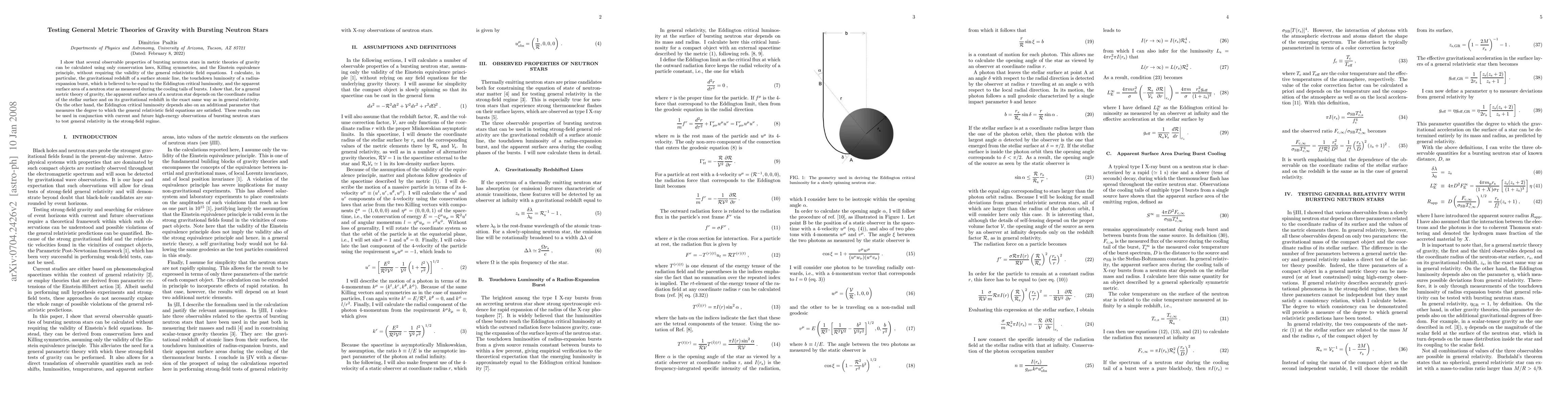 I show that several observable properties of bursting neutron stars in metric theories of gravity can be calculated using only conservation laws, Killing symmetries, and the Einstein equivalence principle, without requiring the validity of the general relativistic field equations. I calculate, in particular, the gravitational redshift of a surface atomic line, the touchdown luminosity of a radius-expansion burst, which is believed to be equal to the Eddington critical luminosity, and the apparent surface area of a neutron star as measured during the cooling tails of bursts. I show that, for a general metric theory of gravity, the apparent surface area of a neutron star depends on the coordinate radius of the stellar surface and on its gravitational redshift in the exact same way as in general relativity. On the other hand, the Eddington critical luminosity depends also on an additional parameter that measures the degree to which the general relativistic field equations are satisfied. These results can be used in conjunction with current and future high-energy observations of bursting neutron stars to test general relativity in the strong-field regime.