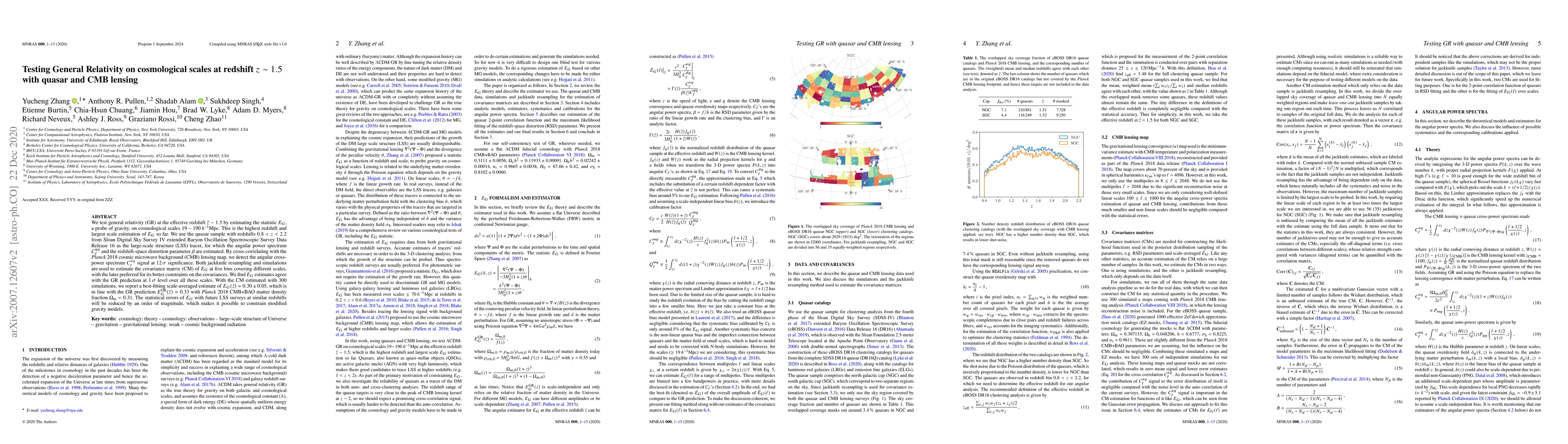 This paper tests general relativity on cosmological scales at redshift z ~ 1.5 using quasar lensing and CMB lensing. The study finds $E_G$ estimates consistent with GR predictions, reporting a best-fit value of $E_G(\bar{z})=0.30\pm 0.05$, which aligns with the GR prediction of $E_G^{\rm GR}(\bar{z})=0.33$.