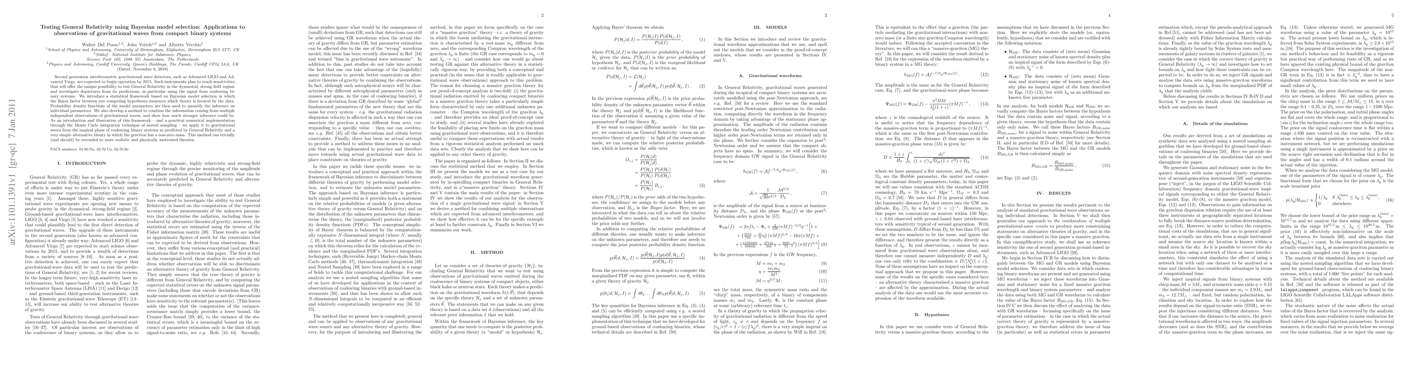 This paper introduces a Bayesian model selection framework to test General Relativity using gravitational wave observations from compact binary systems. It demonstrates the method's application to compare General Relativity predictions with a simple alternative theory featuring massive gravitons, highlighting its potential for stronger inference from multiple observations.