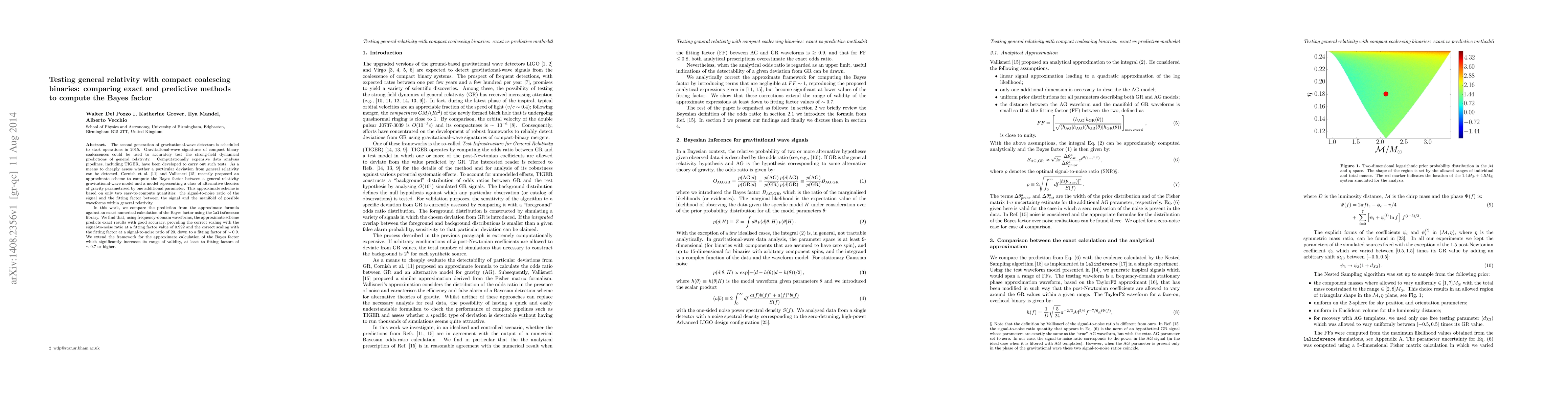 This paper compares an approximate method for computing the Bayes factor between general relativity models and alternative gravity theories against an exact numerical calculation. It finds that the approximate method, using frequency-domain waveforms, accurately predicts exact results, especially at high signal-to-noise ratios and fitting factors, thus extending its applicability to lower fitting factors.