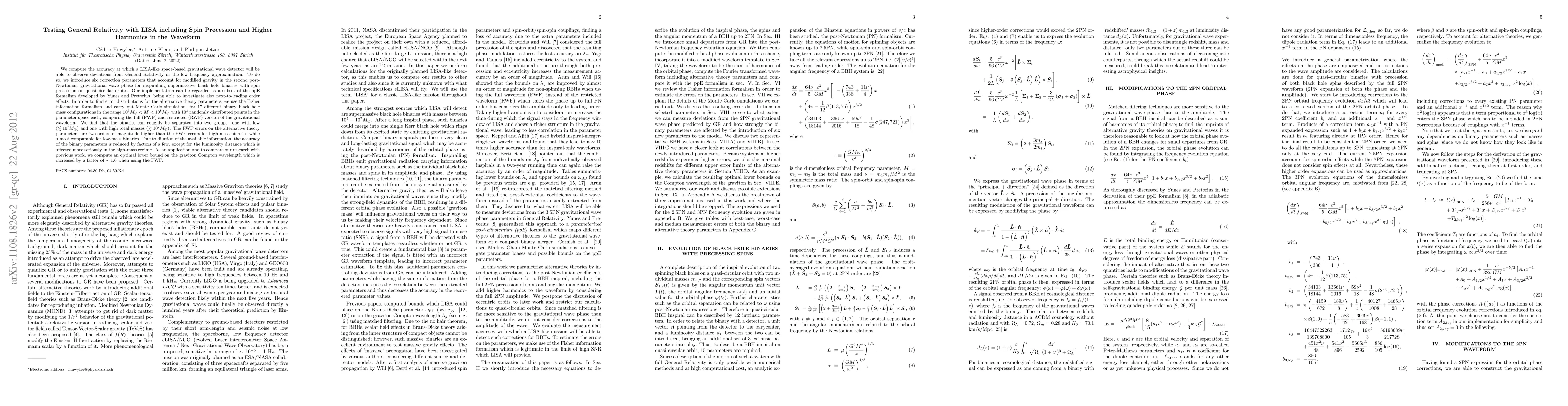 We compute the accuracy at which a LISA-like space-based gravitational wave detector will be able to observe deviations from General Relativity in the low frequency approximation. To do so, we introduce six correction parameters that account for modified gravity in the second post-Newtonian gravitational wave phase for inspiralling supermassive black hole binaries with spin precession on quasi-circular orbits. Our implementation can be regarded as a subset of the ppE formalism developed by Yunes and Pretorius, being able to investigate also next-to-leading order effects. In order to find error distributions for the alternative theory parameters, we use the Fisher information formalism and carry out Monte Carlo simulations for 17 different binary black hole mass configurations in the range 10^5 Msun < M < 10^8 Msun with 10^3 randomly distributed points in the parameter space each, comparing the full (FWF) and restricted (RWF) version of the gravitational waveform. We find that the binaries can roughly be separated into two groups: one with low (< ~10^7 Msun) and one with high total masses (> ~10^7 Msun). The RWF errors on the alternative theory parameters are two orders of magnitude higher than the FWF errors for high-mass binaries while almost comparable for low-mass binaries. Due to dilution of the available information, the accuracy of the binary parameters is reduced by factors of a few, except for the luminosity distance which is affected more seriously in the high-mass regime. As an application and to compare our research with previous work, we compute an optimal lower bound on the graviton Compton wavelength which is increased by a factor of ~1.6 when using the FWF.