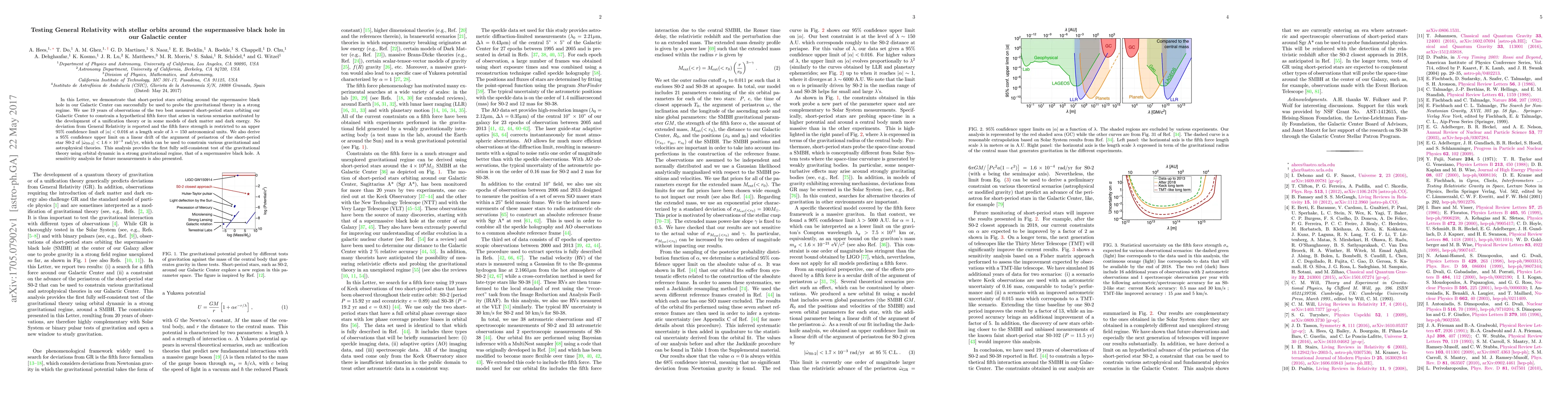 This paper uses 19 years of observations of stars orbiting the supermassive black hole in our Galactic Center to test General Relativity and constrain potential fifth forces, finding no deviations and setting stringent limits on such forces. The study also provides a limit on the linear drift of the argument of periastron for star S0-2, contributing to gravitational theory testing in strong gravitational fields.