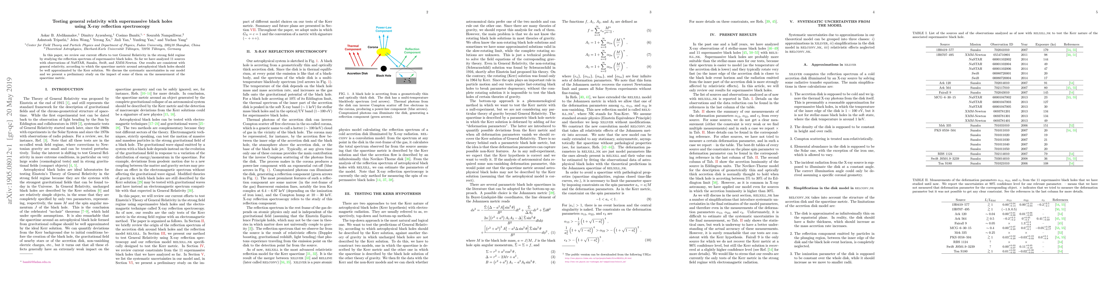The research employs X-ray reflection spectroscopy to test General Relativity in the strong field regime around supermassive black holes, analyzing 11 sources with data from NuSTAR, Suzaku, Swift, and XMM-Newton.