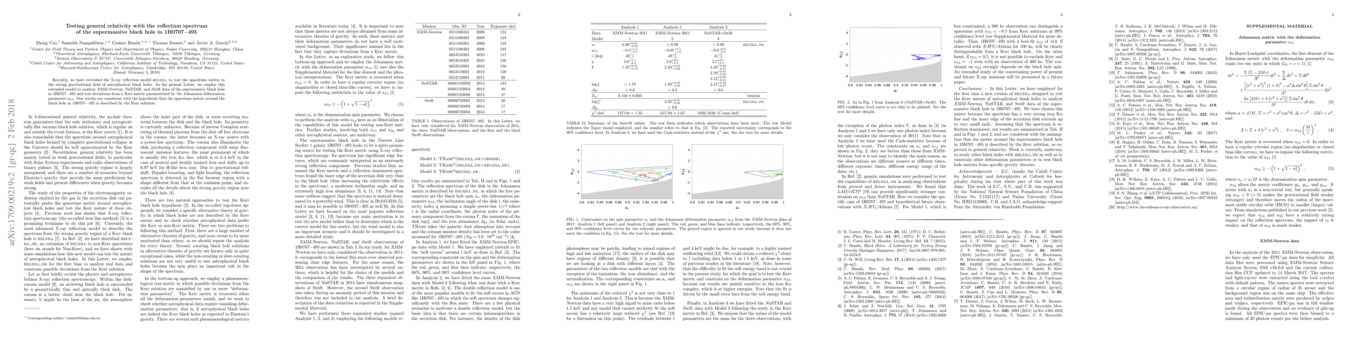 This paper uses the extended X-ray reflection model relxill to analyze data from XMM-Newton, NuSTAR, and Swift for the supermassive black hole in 1H0707-495, testing deviations from the Kerr metric. The results support the hypothesis that the spacetime around this black hole follows the Kerr solution.