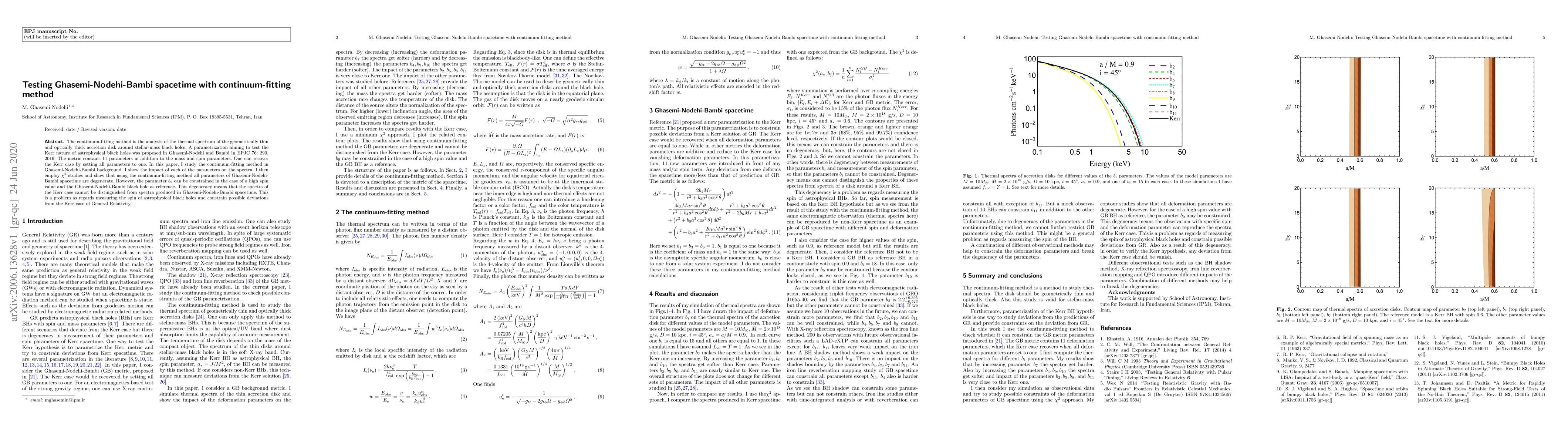 This paper applies the continuum-fitting method to the Ghasemi-Nodehi-Bambi spacetime to analyze the thermal spectrum of accretion disks around black holes. The study finds that most parameters of the model are degenerate, complicating the measurement of black hole spins and indicating potential deviations from the Kerr solution in General Relativity.