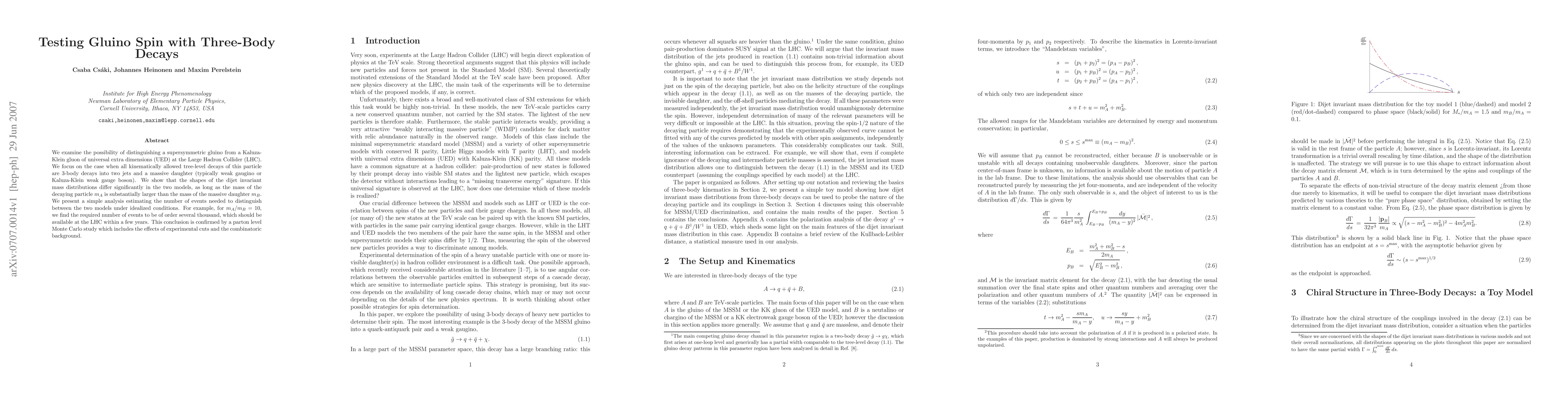 We examine the possibility of distinguishing a supersymmetric gluino from a Kaluza-Klein gluon of universal extra dimensions (UED) at the Large Hadron Collider (LHC). We focus on the case when all kinematically allowed tree-level decays of this particle are 3-body decays into two jets and a massive daughter (typically weak gaugino or Kaluza-Klein weak gauge boson). We show that the shapes of the dijet invariant mass distributions differ significantly in the two models, as long as the mass of the decaying particle mA is substantially larger than the mass of the massive daughter mB. We present a simple analysis estimating the number of events needed to distinguish between the two models under idealized conditions. For example, for mA/mB=10, we find the required number of events to be of order several thousand, which should be available at the LHC within a few years. This conclusion is confirmed by a parton level Monte Carlo study which includes the effects of experimental cuts and the combinatoric background.