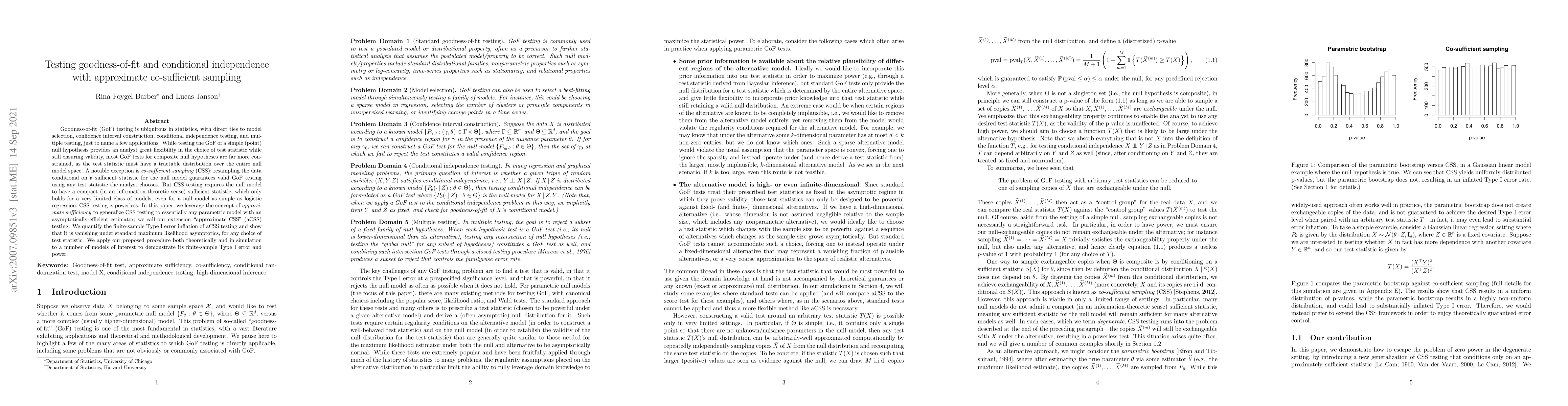 This paper proposes "approximate co-sufficient sampling" (aCSS) testing to generalize goodness-of-fit (GoF) testing for composite null hypotheses beyond models requiring a compact sufficient statistic. The method maintains validity under standard maximum likelihood asymptotics and demonstrates finite-sample Type I error control and power through theoretical analysis and simulations.