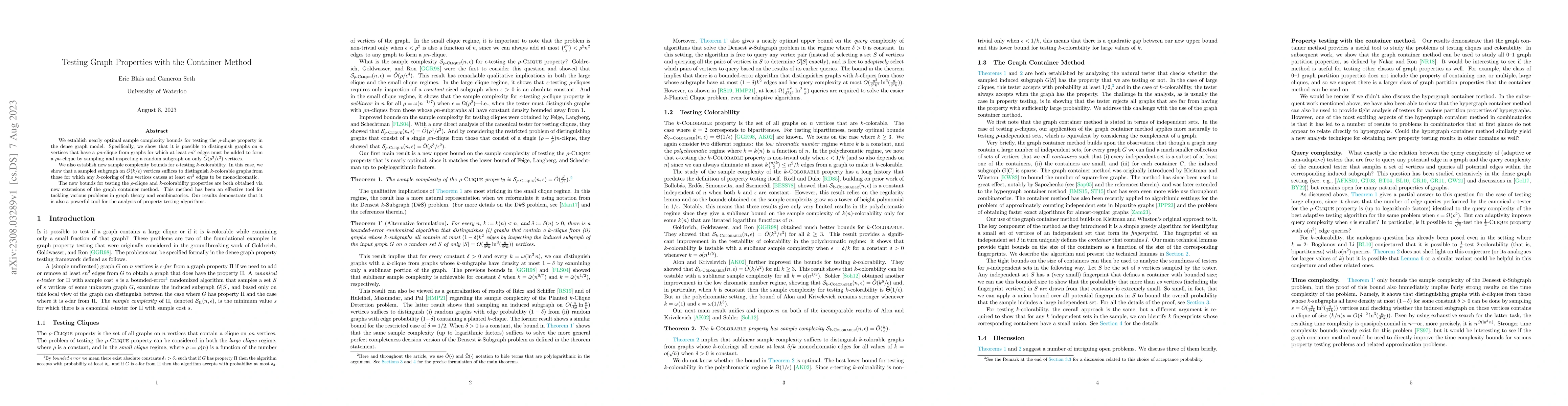 We establish nearly optimal sample complexity bounds for testing the $\rho$-clique property in the dense graph model. Specifically, we show that it is possible to distinguish graphs on $n$ vertices that have a $\rho n$-clique from graphs for which at least $\epsilon n^2$ edges must be added to form a $\rho n$-clique by sampling and inspecting a random subgraph on only $\tilde{O}(\rho^3/\epsilon^2)$ vertices. We also establish new sample complexity bounds for $\epsilon$-testing $k$-colorability. In this case, we show that a sampled subgraph on $\tilde{O}(k/\epsilon)$ vertices suffices to distinguish $k$-colorable graphs from those for which any $k$-coloring of the vertices causes at least $\epsilon n^2$ edges to be monochromatic. The new bounds for testing the $\rho$-clique and $k$-colorability properties are both obtained via new extensions of the graph container method. This method has been an effective tool for tackling various problems in graph theory and combinatorics. Our results demonstrate that it is also a powerful tool for the analysis of property testing algorithms.