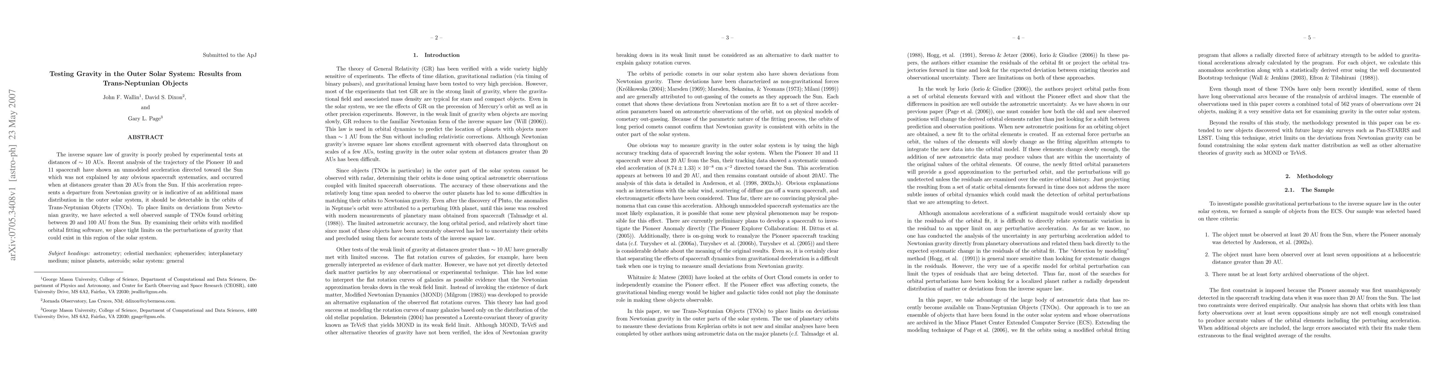 This paper investigates deviations from Newtonian gravity in the outer solar system by analyzing the orbits of Trans-Neptunian Objects (TNOs) between 20 and 100 AU from the Sun. The study aims to detect any unexplained gravitational perturbations, prompted by an unexplained acceleration observed in Pioneer spacecraft trajectories beyond 20 AU.