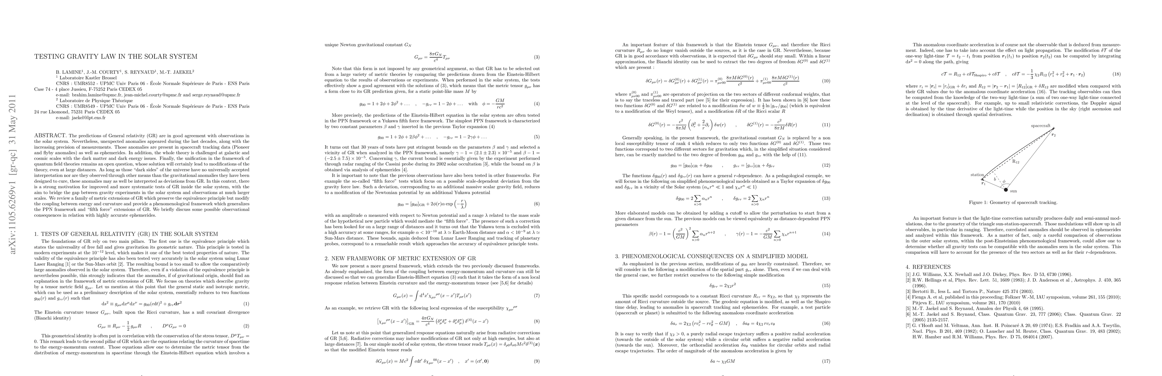 The predictions of General relativity (GR) are in good agreement with observations in the solar system. Nevertheless, unexpected anomalies appeared during the last decades, along with the increasing precision of measurements. Those anomalies are present in spacecraft tracking data (Pioneer and flyby anomalies) as well as ephemerides. In addition, the whole theory is challenged at galactic and cosmic scales with the dark matter and dark energy issues. Finally, the unification in the framework of quantum field theories remains an open question, whose solution will certainly lead to modifications of the theory, even at large distances. As long as those "dark sides" of the universe have no universally accepted interpretation nor are they observed through other means than the gravitational anomalies they have been designed to cure, these anomalies may as well be interpreted as deviations from GR. In this context, there is a strong motivation for improved and more systematic tests of GR inside the solar system, with the aim to bridge the gap between gravity experiments in the solar system and observations at much larger scales. We review a family of metric extensions of GR which preserve the equivalence principle but modify the coupling between energy and curvature and provide a phenomenological framework which generalizes the PPN framework and "fifth force" extensions of GR. We briefly discuss some possible observational consequences in connection with highly accurate ephemerides.