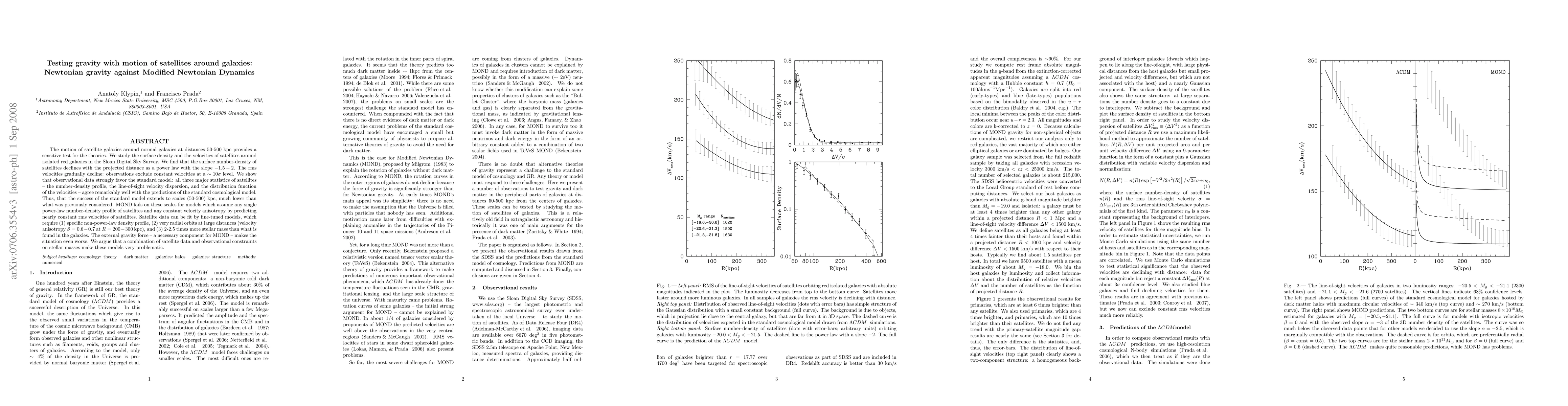 The motion of satellite galaxies around normal galaxies at distances 50-500 kpc provides a sensitive test for the theories. We study the surface density and the velocities of satellites around isolated galaxies in the Sloan Digital Sky Survey. We find that the surface number-density of satellites declines with the projected distance as a power law with the slope -1.5-2. The rms velocities gradually decline: observations exclude constant velocities at a 10 sigma level. We show that observational data strongly favor the standard model: all three major statistics of satellites - the number-density profile, the line-of-sight velocity dispersion, and the distribution function of the velocities -- agree remarkably well with the predictions of the standard cosmological model. Thus, that the success of the standard model extends to scales (50-500) kpc, much lower than what was previously considered. MOND fails on these scales for models which assume any single power-law number-density profile of satellites and any constant velocity anisotropy by predicting nearly constant rms velocities of satellites. Satellite data can be fit by fine-tuned models, which require (1) specific non-power-law density profile, (2) very radial orbits at large distances (velocity anisotropy beta =0.6-0.7 at 200-300 kpc), and (3) 2-2.5 times more stellar mass than what is found in the galaxies. The external gravity force - a necessary component for MOND -- makes the situation even worse. We argue that a combination of satellite data and observational constraints on stellar masses make these models very problematic.