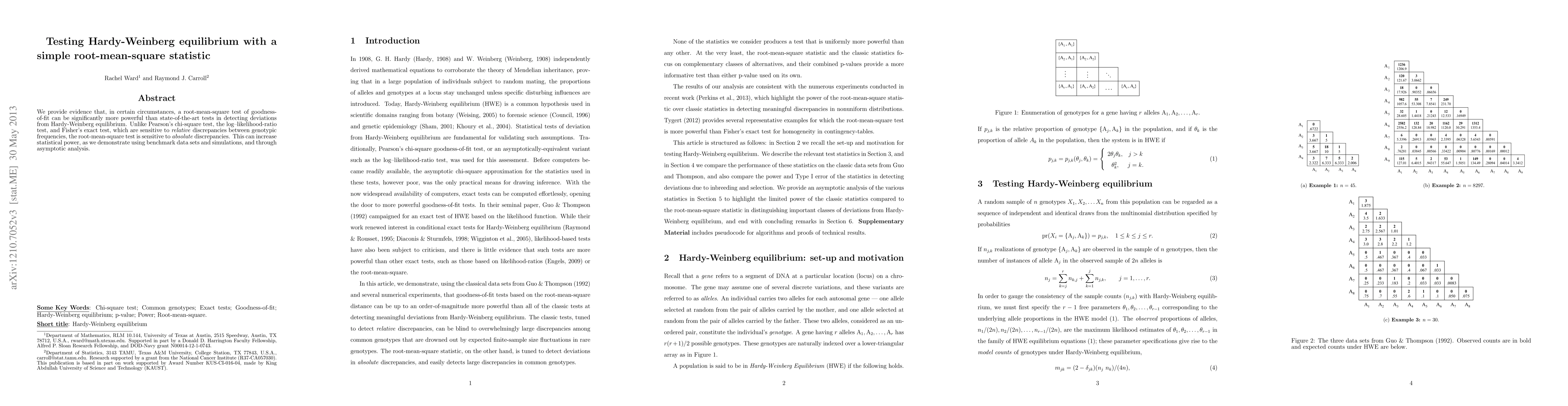This paper proposes a root-mean-square test for detecting deviations from Hardy-Weinberg equilibrium, demonstrating its greater statistical power compared to traditional methods like Pearson's chi-square test. The new method focuses on absolute discrepancies rather than relative ones, and its exact P-values can be computed with ease using available code.