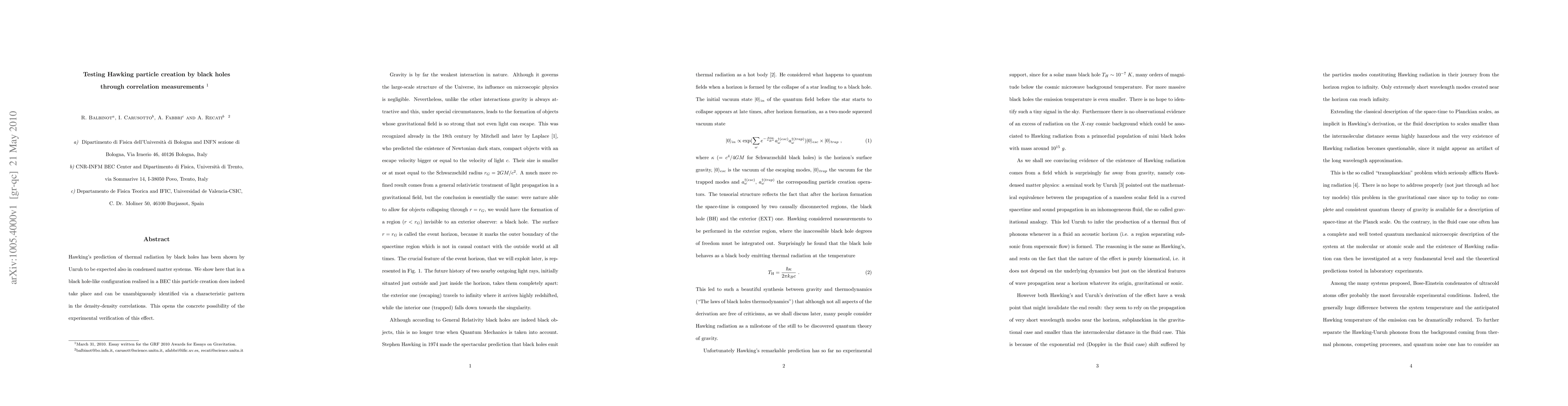 Hawking's prediction of thermal radiation by black holes has been shown by Unruh to be expected also in condensed matter systems. We show here that in a black hole-like configuration realised in a BEC this particle creation does indeed take place and can be unambiguously identified via a characteristic pattern in the density-density correlations. This opens the concrete possibility of the experimental verification of this effect.