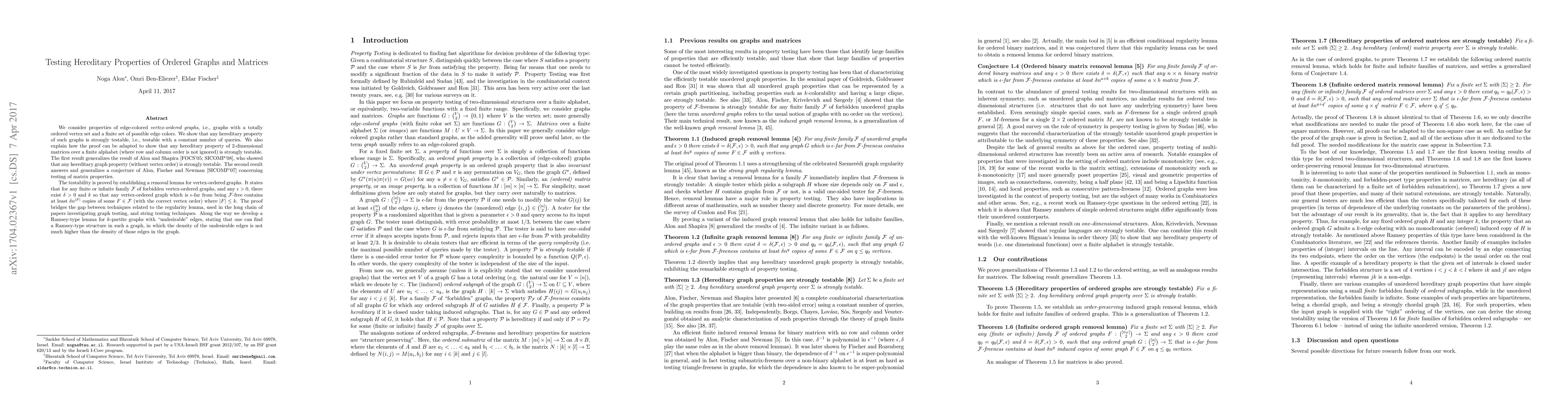 We consider properties of edge-colored vertex-ordered graphs, i.e., graphs with a totally ordered vertex set and a finite set of possible edge colors. We show that any hereditary property of such graphs is strongly testable, i.e., testable with a constant number of queries. We also explain how the proof can be adapted to show that any hereditary property of $2$-dimensional matrices over a finite alphabet (where row and column order is not ignored) is strongly testable. The first result generalizes the result of Alon and Shapira [FOCS'05, SICOMP'08], who showed that any hereditary graph property (without vertex order) is strongly testable. The second result answers and generalizes a conjecture of Alon, Fischer and Newman [SICOMP'07] concerning testing of matrix properties. The testability is proved by establishing a removal lemma for vertex-ordered graphs. It states that for any finite or infinite family $\mathcal{F}$ of forbidden vertex-ordered graphs, and any $\epsilon > 0$, there exist $\delta > 0$ and $k$ so that any vertex-ordered graph which is $\epsilon$-far from being $\mathcal{F}$-free contains at least $\delta n^{|F|}$ copies of some $F\in\mathcal{F}$ (with the correct vertex order) where $|F|\leq k$. The proof bridges the gap between techniques related to the regularity lemma, used in the long chain of papers investigating graph testing, and string testing techniques. Along the way we develop a Ramsey-type lemma for $k$-partite graphs with "undesirable" edges, stating that one can find a Ramsey-type structure in such a graph, in which the density of the undesirable edges is not much higher than the density of those edges in the graph.