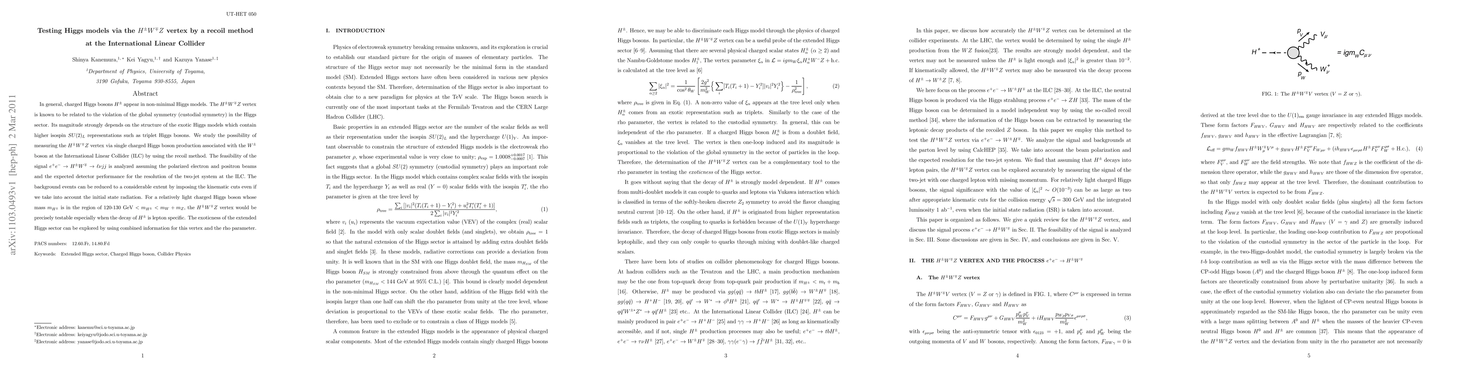 This paper investigates the feasibility of measuring the $H^\pm W^\mp Z$ vertex in non-minimal Higgs models at the International Linear Collider (ILC) using a recoil method. The study finds that the vertex can be precisely tested for relatively light charged Higgs bosons, especially when their decay is lepton specific, allowing for exploration of the exotic Higgs sector.