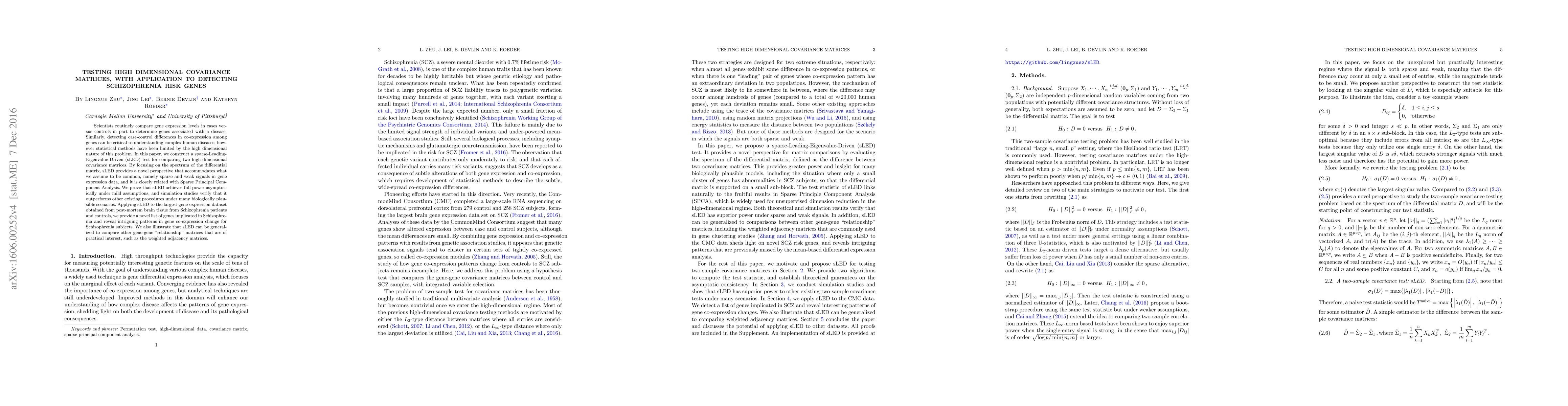 This paper introduces a novel sLED test for comparing high-dimensional covariance matrices, which is shown to outperform existing methods in detecting sparse and weak signals in gene expression data. The method is applied to gene-expression data from schizophrenia patients, identifying new genes associated with the disease and revealing patterns in gene co-expression changes.
