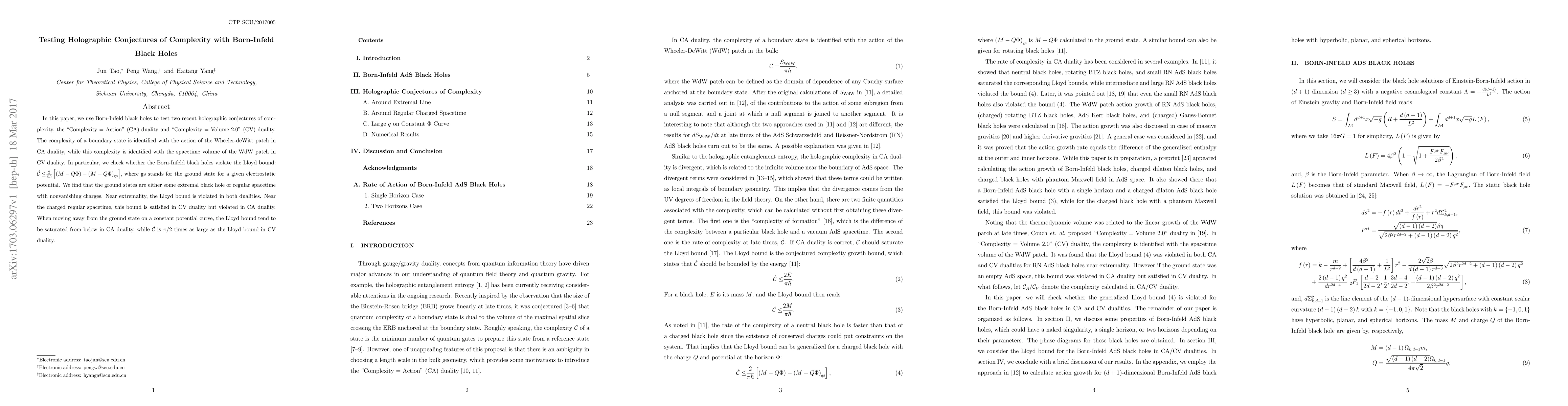 In this paper, we use Born-Infeld black holes to test two recent holographic conjectures of complexity, the "Complexity = Action" (CA) duality and "Complexity = Volume 2.0" (CV) duality. The complexity of a boundary state is identified with the action of the Wheeler-deWitt patch in CA duality, while this complexity is identified with the spacetime volume of the WdW patch in CV duality. In particular, we check whether the Born-Infeld black holes violate the Lloyd bound: $\mathcal{\dot{C}\leq}\frac{2}{\pi\hbar}\left[ \left( M-Q\Phi\right) -\left( M-Q\Phi\right) _{\text{gs}}\right] $, where gs stands for the ground state for a given electrostatic potential. We find that the ground states are either some extremal black hole or regular spacetime with nonvanishing charges. Near extremality, the Lloyd bound is violated in both dualities. Near the charged regular spacetime, this bound is satisfied in CV duality but violated in CA duality. When moving away from the ground state on a constant potential curve, the Lloyd bound tend to be saturated from below in CA duality, while $\mathcal{\dot{C}}$ is $\pi/2$ times as large as the Lloyd bound in CV duality.