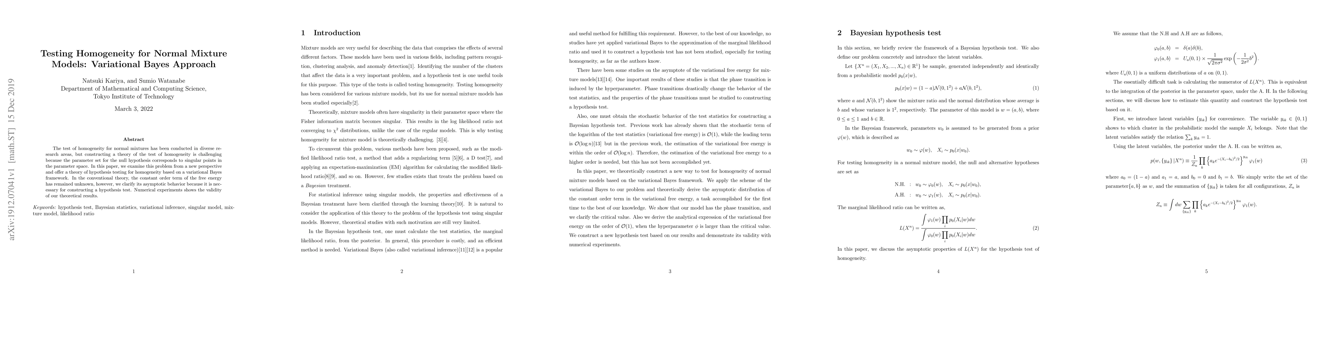 This paper proposes a new theory for testing homogeneity in normal mixture models using a variational Bayes approach, addressing the challenge of singular points in the parameter space. The authors clarify the asymptotic behavior of the constant order term of the free energy, essential for hypothesis testing, and validate their approach through numerical experiments.