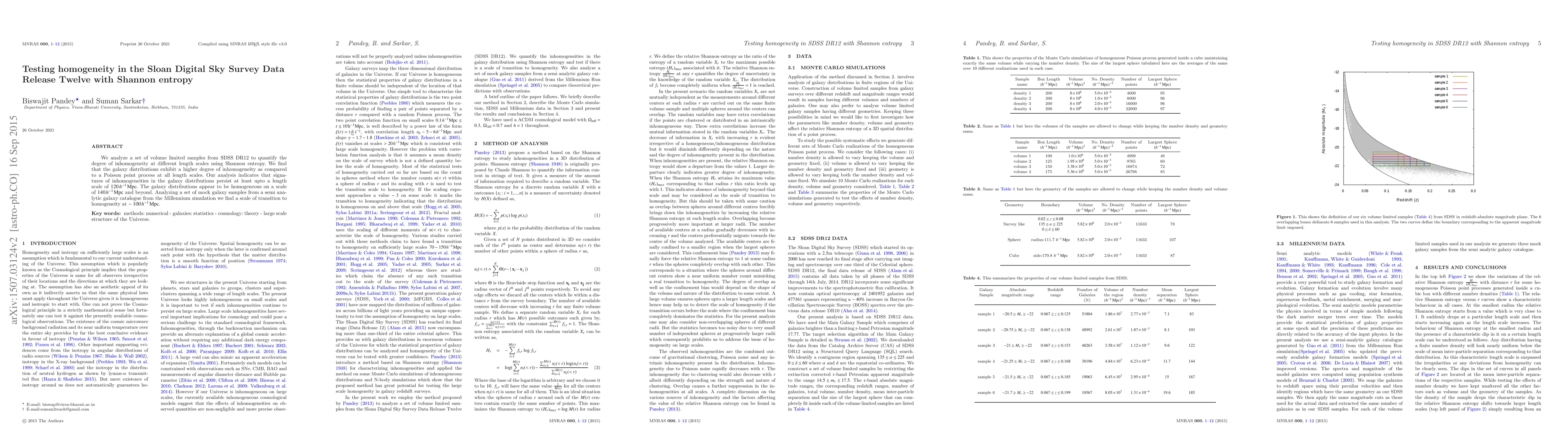 This study uses Shannon entropy to analyze volume-limited samples from SDSS DR12, revealing that galaxy distributions show higher inhomogeneity compared to a Poisson process, persisting up to $120 \, h^{-1}\, {\rm Mpc}$. On larger scales, galaxies appear homogeneous, transitioning around $140 \, h^{-1}\, {\rm Mpc}$.