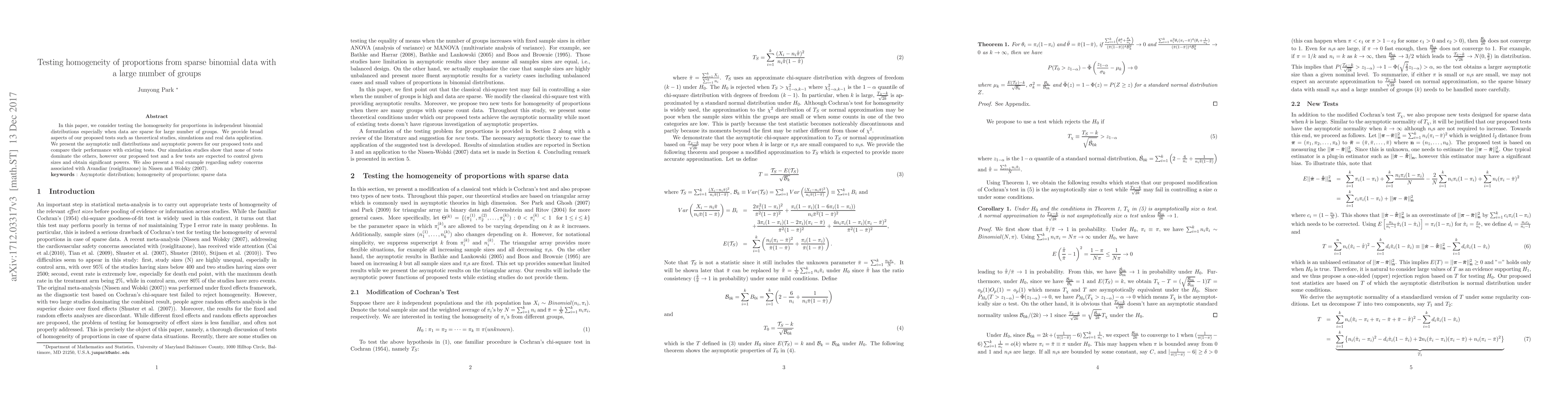 This paper proposes new tests for assessing homogeneity of proportions in sparse binomial data across many groups, comparing their performance through simulations and real data applications. The proposed tests show competitive control over given sizes and power, with no single test consistently outperforming others.