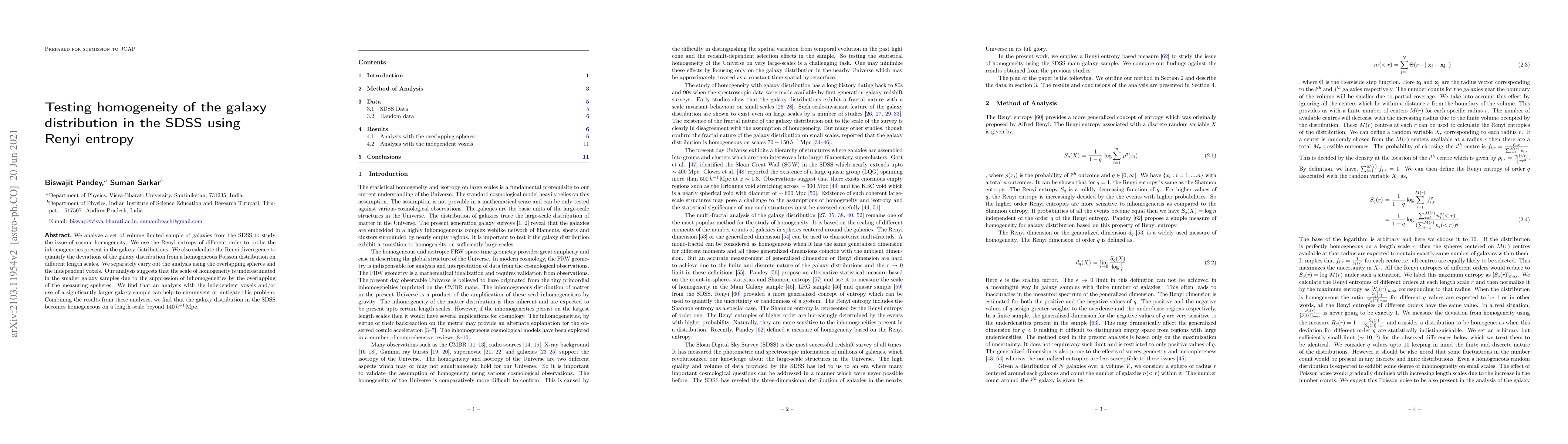 This paper investigates cosmic homogeneity using Renyi entropy on a volume-limited galaxy sample from the SDSS. It finds that the galaxy distribution becomes homogeneous on scales beyond $140 \, h^{-1}\, {\rm Mpc}$, but smaller samples underestimate this scale due to overlapping measurement spheres.