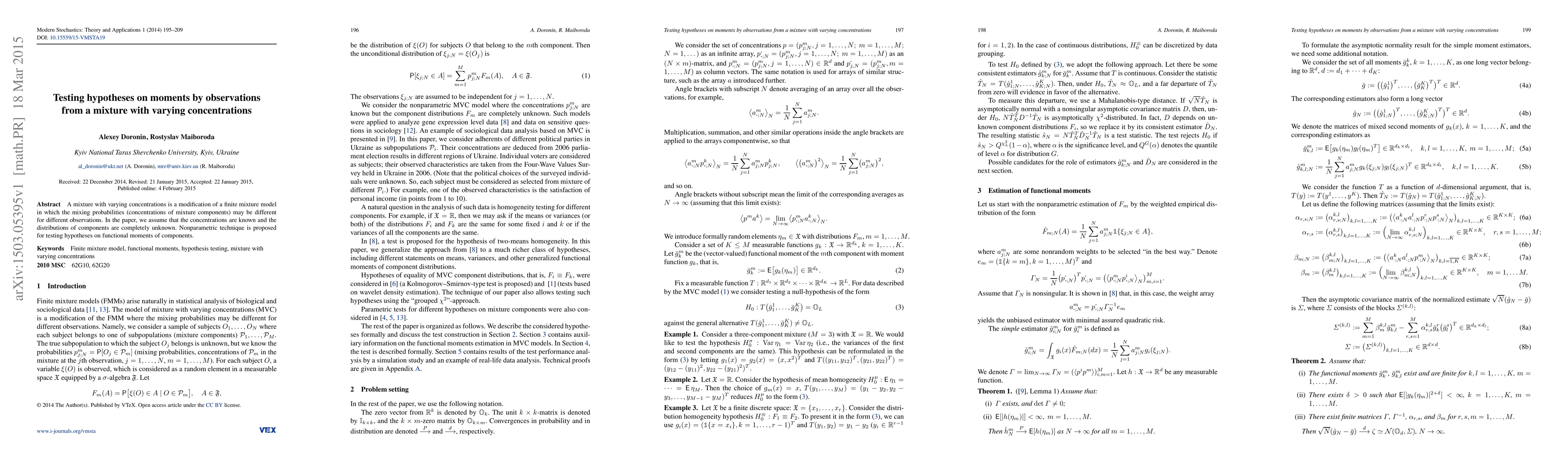 Summary: This paper proposes a nonparametric method for testing hypotheses on functional moments of components in a mixture model with varying concentrations, where the mixing probabilities are known and component distributions are completely unknown.