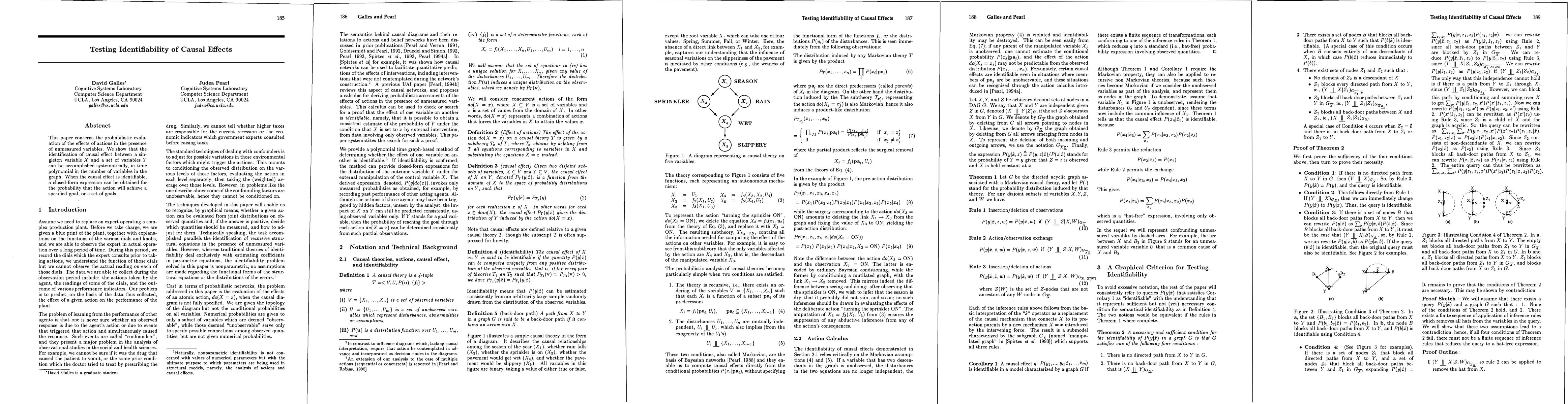 This paper concerns the probabilistic evaluation of the effects of actions in the presence of unmeasured variables. We show that the identification of causal effect between a singleton variable X and a set of variables Y can be accomplished systematically, in time polynomial in the number of variables in the graph. When the causal effect is identifiable, a closed-form expression can be obtained for the probability that the action will achieve a specified goal, or a set of goals.