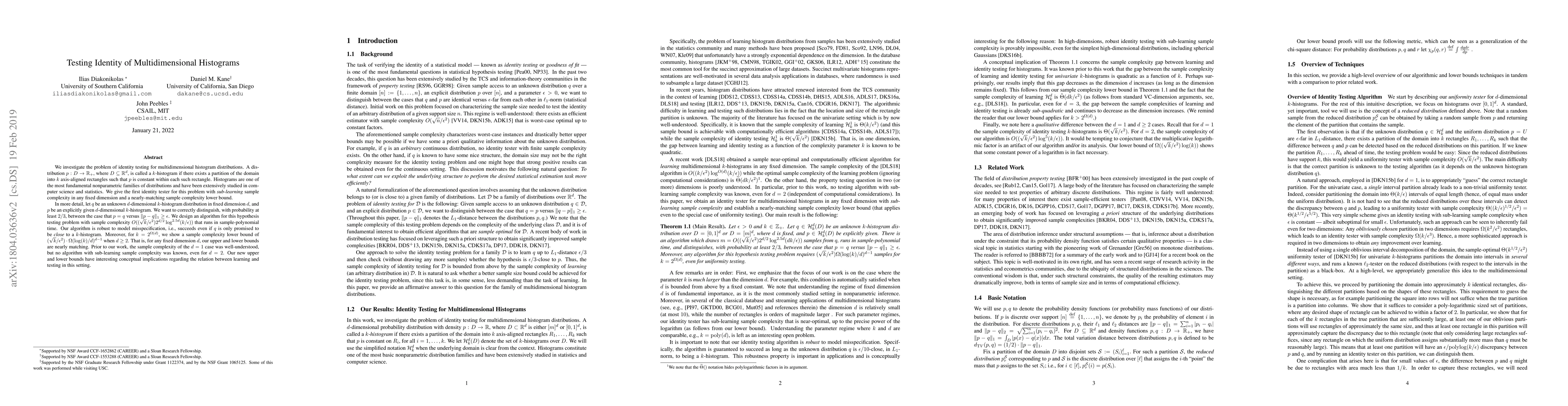 This paper presents an identity tester for multidimensional histogram distributions with sub-learning sample complexity, providing an efficient algorithm for distinguishing between two histograms with high probability. The algorithm achieves nearly matching upper and lower bounds for fixed dimensions, advancing understanding of the relationship between learning and testing in this context.