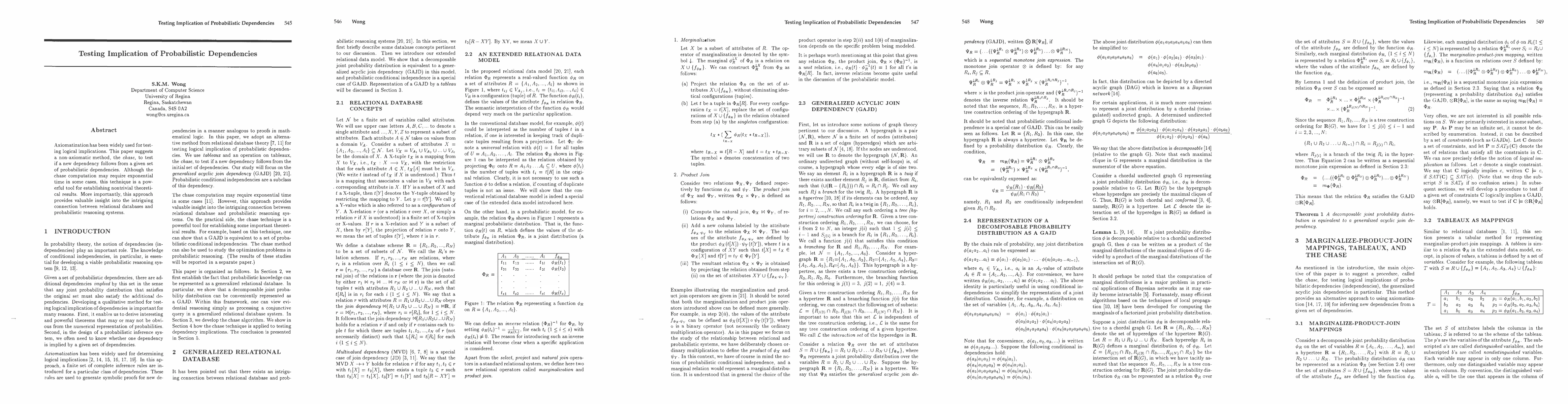 Axiomatization has been widely used for testing logical implications. This paper suggests a non-axiomatic method, the chase, to test if a new dependency follows from a given set of probabilistic dependencies. Although the chase computation may require exponential time in some cases, this technique is a powerful tool for establishing nontrivial theoretical results. More importantly, this approach provides valuable insight into the intriguing connection between relational databases and probabilistic reasoning systems.