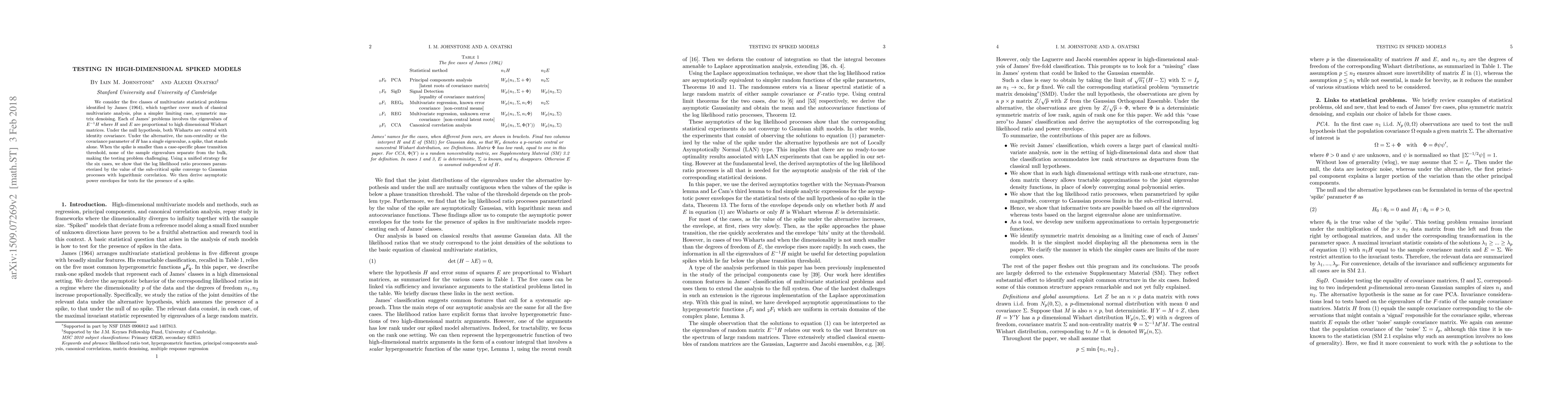We consider the five classes of multivariate statistical problems identified by James (1964), which together cover much of classical multivariate analysis, plus a simpler limiting case, symmetric matrix denoising. Each of James' problems involves the eigenvalues of $E^{-1}H$ where $H$ and $E$ are proportional to high dimensional Wishart matrices. Under the null hypothesis, both Wisharts are central with identity covariance. Under the alternative, the non-centrality or the covariance parameter of $H$ has a single eigenvalue, a spike, that stands alone. When the spike is smaller than a case-specific phase transition threshold, none of the sample eigenvalues separate from the bulk, making the testing problem challenging. Using a unified strategy for the six cases, we show that the log likelihood ratio processes parameterized by the value of the sub-critical spike converge to Gaussian processes with logarithmic correlation. We then derive asymptotic power envelopes for tests for the presence of a spike.