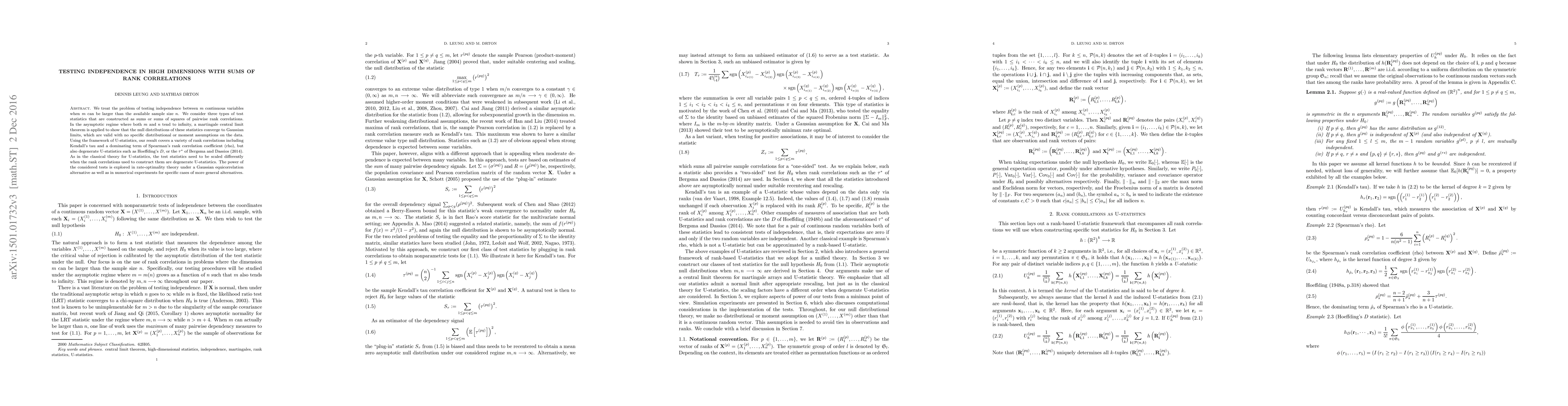 We treat the problem of testing independence between m continuous variables when m can be larger than the available sample size n. We consider three types of test statistics that are constructed as sums or sums of squares of pairwise rank correlations. In the asymptotic regime where both m and n tend to infinity, a martingale central limit theorem is applied to show that the null distributions of these statistics converge to Gaussian limits, which are valid with no specific distributional or moment assumptions on the data. Using the framework of U-statistics, our result covers a variety of rank correlations including Kendall's tau and a dominating term of Spearman's rank correlation coefficient (rho), but also degenerate U-statistics such as Hoeffding's $D$, or the $\tau^*$ of Bergsma and Dassios (2014). As in the classical theory for U-statistics, the test statistics need to be scaled differently when the rank correlations used to construct them are degenerate U-statistics. The power of the considered tests is explored in rate-optimality theory under Gaussian equicorrelation alternatives as well as in numerical experiments for specific cases of more general alternatives.