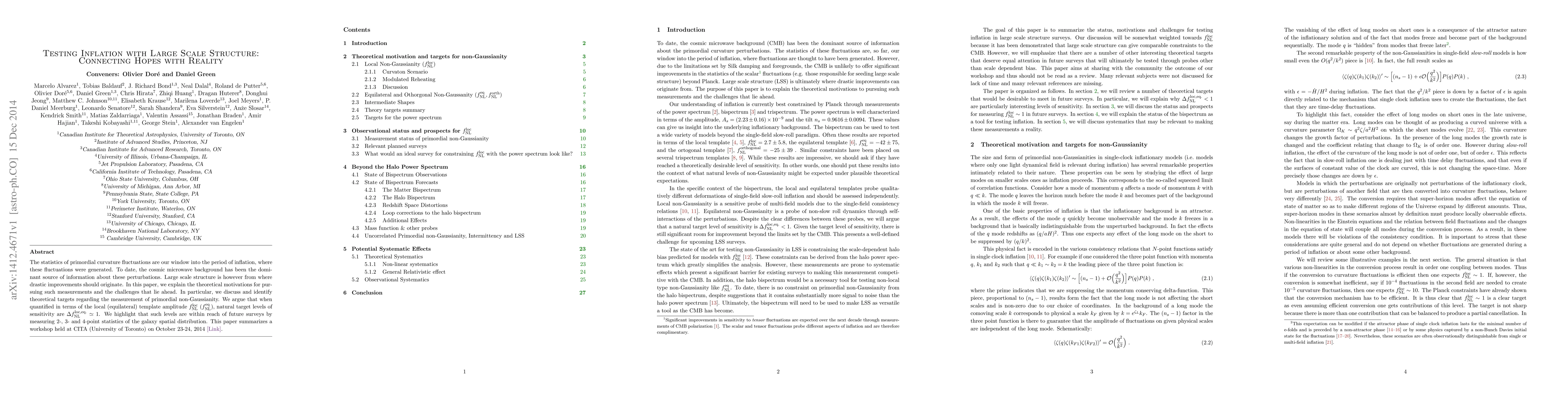 The statistics of primordial curvature fluctuations are our window into the period of inflation, where these fluctuations were generated. To date, the cosmic microwave background has been the dominant source of information about these perturbations. Large scale structure is however from where drastic improvements should originate. In this paper, we explain the theoretical motivations for pursuing such measurements and the challenges that lie ahead. In particular, we discuss and identify theoretical targets regarding the measurement of primordial non-Gaussianity. We argue that when quantified in terms of the local (equilateral) template amplitude $f_{\rm NL}^{\rm loc}$ ($f_{\rm NL}^{\rm eq}$), natural target levels of sensitivity are $\Delta f_{\rm NL}^{\rm loc, eq.} \simeq 1$. We highlight that such levels are within reach of future surveys by measuring 2-, 3- and 4-point statistics of the galaxy spatial distribution. This paper summarizes a workshop held at CITA (University of Toronto) on October 23-24, 2014.