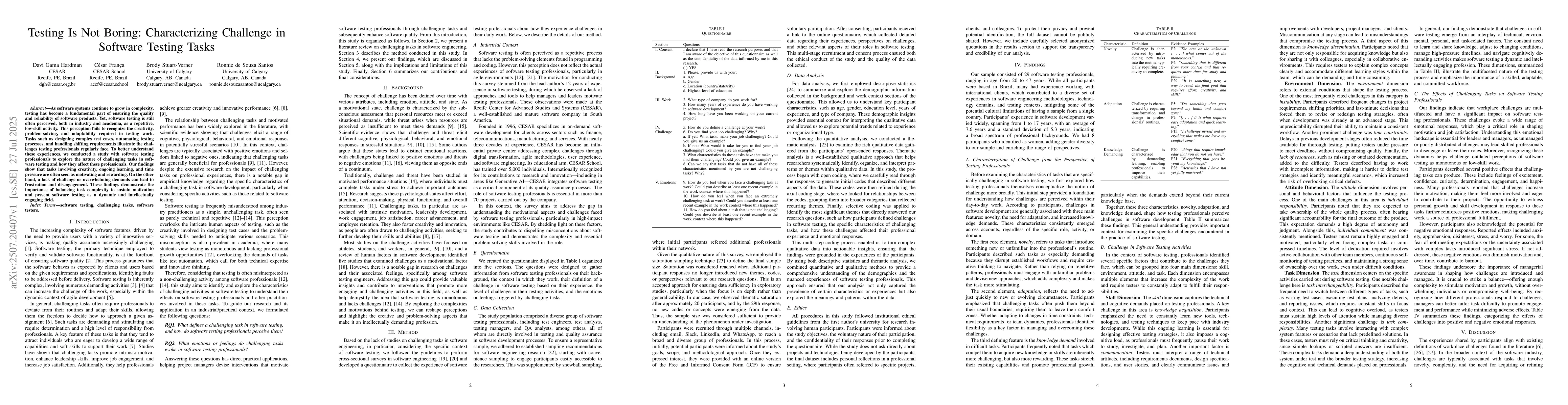 As software systems continue to grow in complexity, testing has become a fundamental part of ensuring the quality and reliability of software products. Yet, software testing is still often perceived, both in industry and academia, as a repetitive, low-skill activity. This perception fails to recognize the creativity, problem-solving, and adaptability required in testing work. Tasks such as designing complex test cases, automating testing processes, and handling shifting requirements illustrate the challenges testing professionals regularly face. To better understand these experiences, we conducted a study with software testing professionals to explore the nature of challenging tasks in software testing and how they affect these professionals. Our findings show that tasks involving creativity, ongoing learning, and time pressure are often seen as motivating and rewarding. On the other hand, a lack of challenge or overwhelming demands can lead to frustration and disengagement. These findings demonstrate the importance of balancing task complexity to sustain motivation and present software testing as a dynamic and intellectually engaging field.